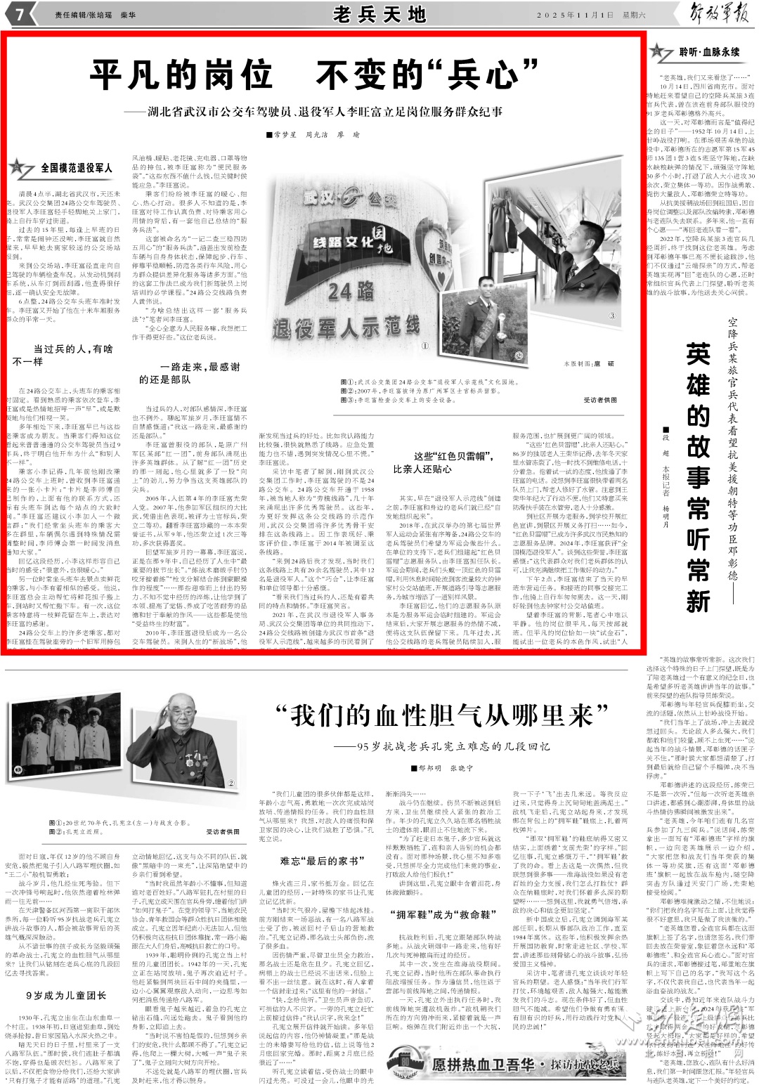 荆楚网(湖北日报网)讯(记者 周光洁 通讯员 常梦星、廖瑜)11月1日,《解放军报》老兵天地版刊发《平凡的岗位 不变的“兵心”——湖北省武汉市公交车驾驶员、退役军人李旺富立足岗位服务群众纪事》报道。