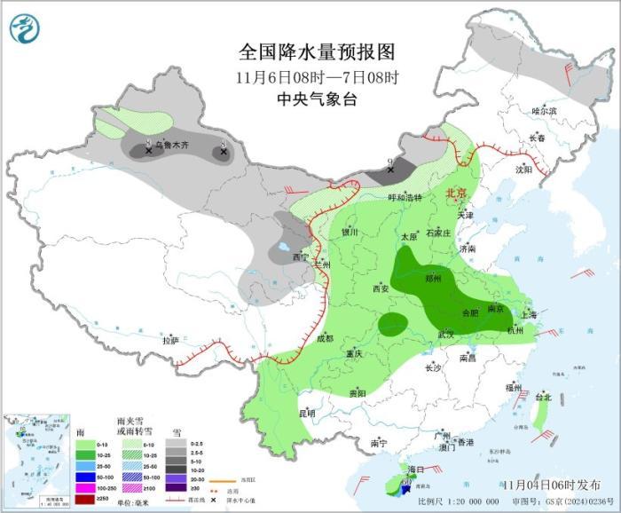 11月4日8时至5日8时,新疆西北部和南疆西部、西藏西部和东南部、内蒙古中部和东北部、黑龙江北部的部分地区有小到中雪或雨夹雪,其中新疆沿天山西部、内蒙古中部的部分地区有大到暴雪,局地大暴雪(10~22毫米),新增积雪4~6厘米,局地可超过10厘米。甘肃东南部、陕西西南部、四川东北部、重庆北部、江南南部、华南等地的部分地区有小到中雨,其中海南岛东部有大到暴雨,局地大暴雨(100~180毫米)。新疆北部和南疆西部、内蒙中东部、东北地区有5~6级风,阵风7~8级。