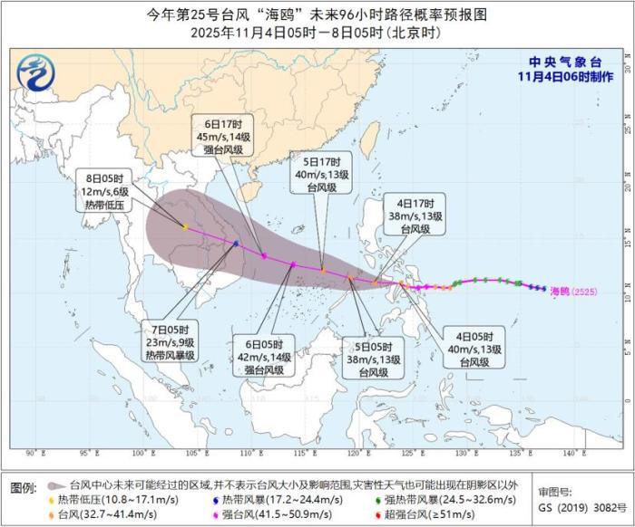 今年第25号台风“海鸥”已于昨天(3日)晚上由台风级加强为强台风级,并于今天(4日)凌晨0时前后在菲律宾莱特岛沿海登陆,登陆时中心附近最大风力达14级(42米/秒)。登陆后“海鸥”减弱为台风级,今天早晨5点钟其中心位于菲律宾群岛中部地区,距离菲律宾马尼拉东南方向大约510公里,中心附近最大风力有13级(40米/秒),中心最低气压为960百帕,七级风圈半径200~320公里,十级风圈半径100~140公里,十二级风圈半径40~50公里。预计,“海鸥”将以每小时20~25公里左右的速度向偏西方向移动,强度将有所减弱,穿过菲律宾中部后,将于5日早晨移入南海东南部海面,强度将再度加强,最强可达强台风级(42~48米/秒,14~15级),6日夜间趋向越南中部沿海。