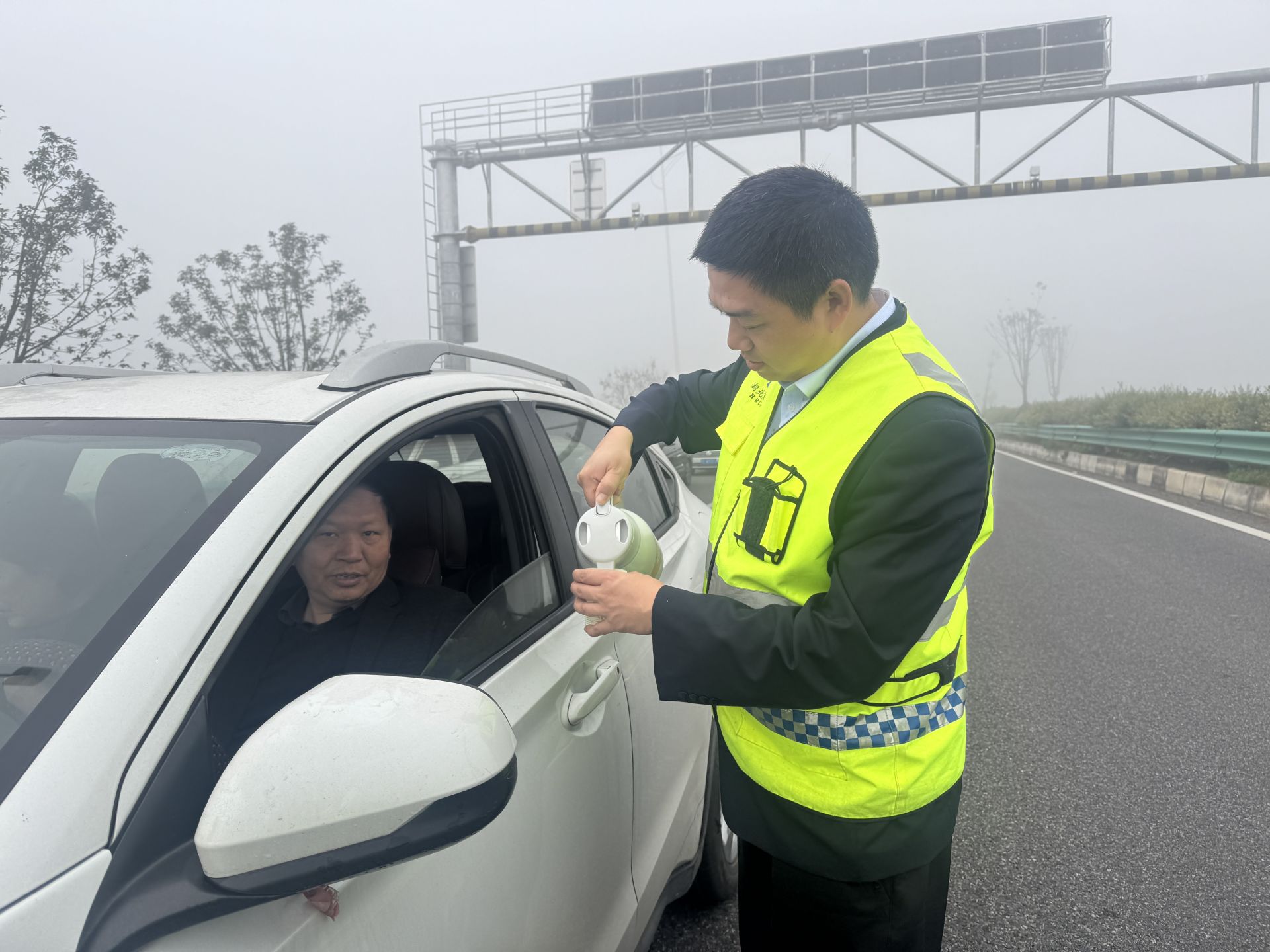 在这略显压抑的氛围中,一群身穿红色爱路志愿者马甲的工作人员迅速行动起来。他们没有丝毫迟疑,分工明确地投入到服务滞留司乘的工作中,用行动驱散着大家心中的阴霾。几位工作人员手提装满热水的保温桶,小心翼翼地在车流中穿行,逐车为司乘人员送上热水。“师傅,天凉,喝点热水暖暖身子,气象部门说雾很快会散,您耐心等一会儿。” 工作人员一边递上温热的水杯,一边轻声安抚,话语里满是真诚。接过热水的货车司机王先生,双手捧着杯子,指尖传来的暖意瞬间蔓延至全身,他原本紧绷的嘴角渐渐舒展,感动地说:“本来因为滞留心里特别烦躁,没想到你们还专门送热水,喝上这杯热水,心里一下子暖和多了,太谢谢你们了!”
