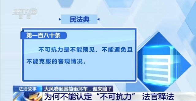 对于周女士的诉求,被告开发商辩称,围挡是被大风刮到周女士车上的,事发当天大风和暴雨的天气情况属于不可抗力,而根据民法典关于不可抗力的相关规定,因不可抗力产生的损失应由原告自行承担。