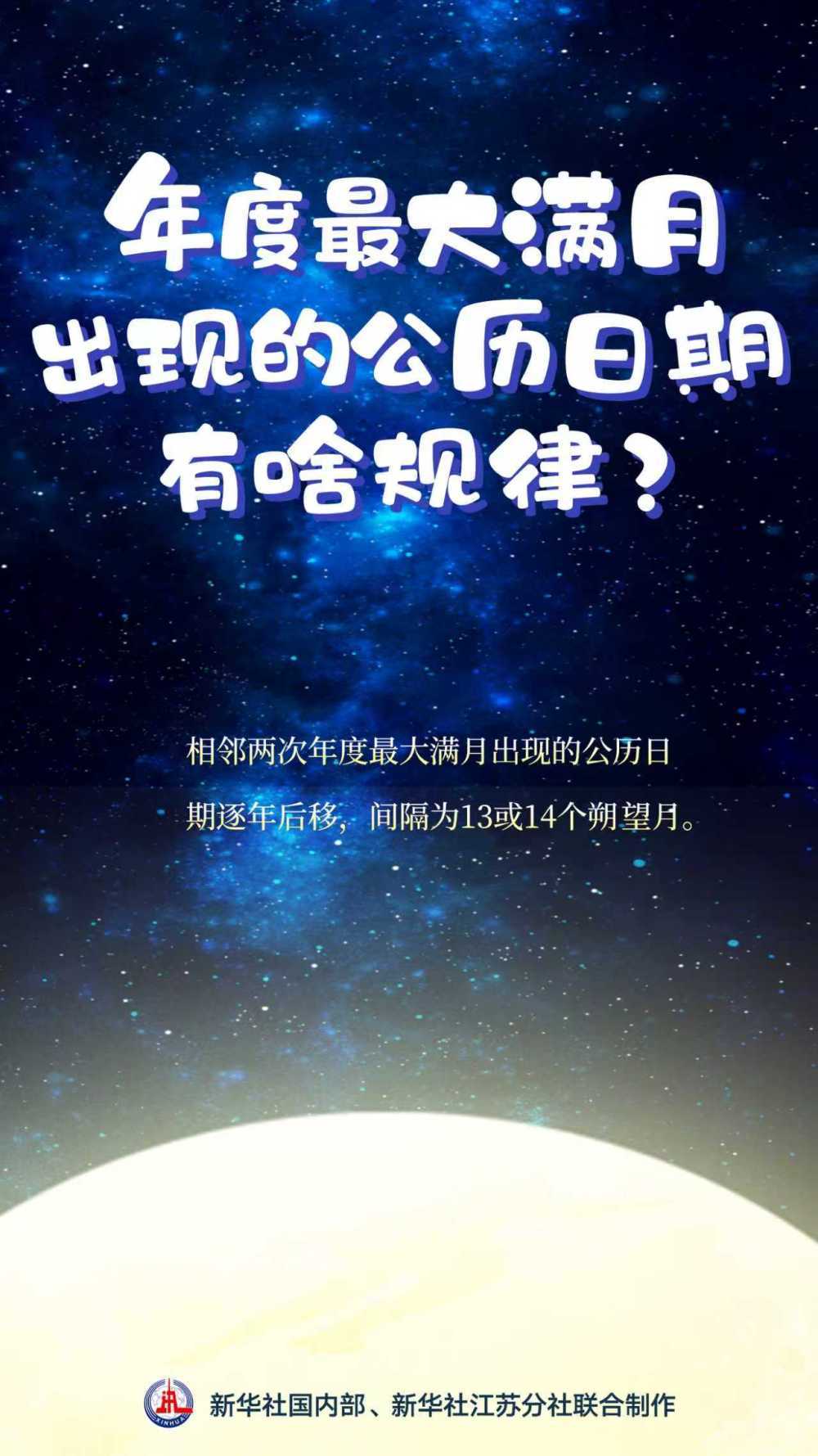 2024年最大满月出现在10月17日、2023年出现在8月31日、2022年出现在7月14日……年度最大满月出现的公历日期有何规律?王科超表示,月球过近地点的平均周期约为27.55天,满月出现的平均周期为29.53天,二者不同步,导致满月位于近地点的时间逐渐向后“漂移”。具体来讲,相邻两次年度最大满月出现的公历日期逐年后移,间隔13或14个朔望月。