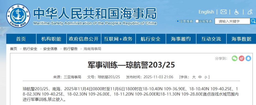 央视网消息:据中国海事局网站消息,三亚海事局发布航行警告,11月4日8时至6日18时,南海部分海域进行军事训练,禁止驶入。