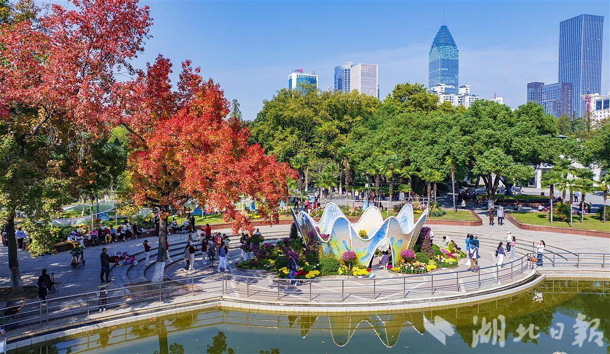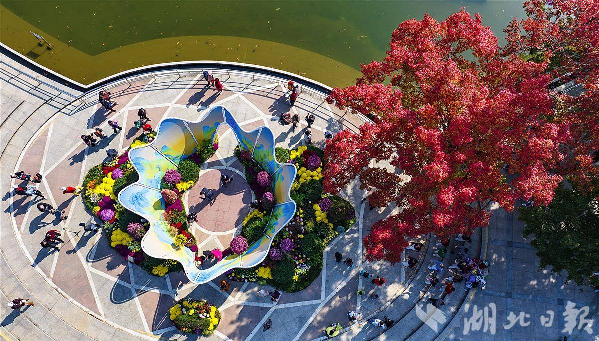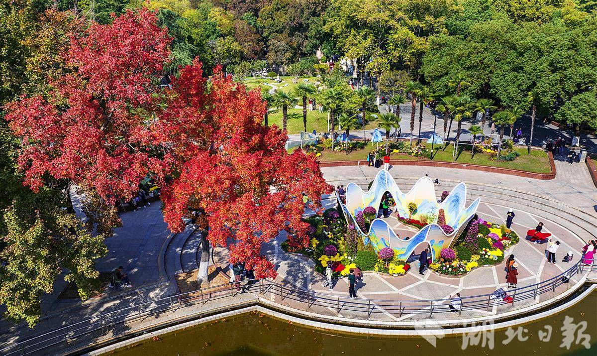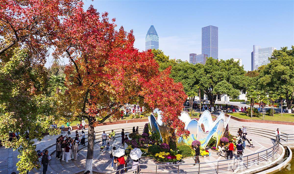 11月4日,武汉中山公园喷泉池旁边的两株枫树已是一片火红,树下正举行第42届金秋菊展,许多游客和市民来到这里拍照游玩。有网友称:中山公园不仅是武汉闹市之中的“绿宝石”,而且也是武汉闹市之中秋天的“调色板”,枫叶红了,武汉的秋天就来了。(湖北日报全媒记者 朱熙勇 摄)