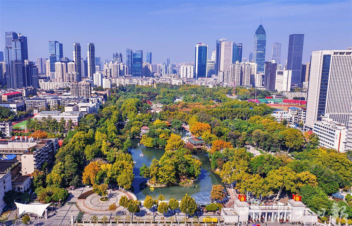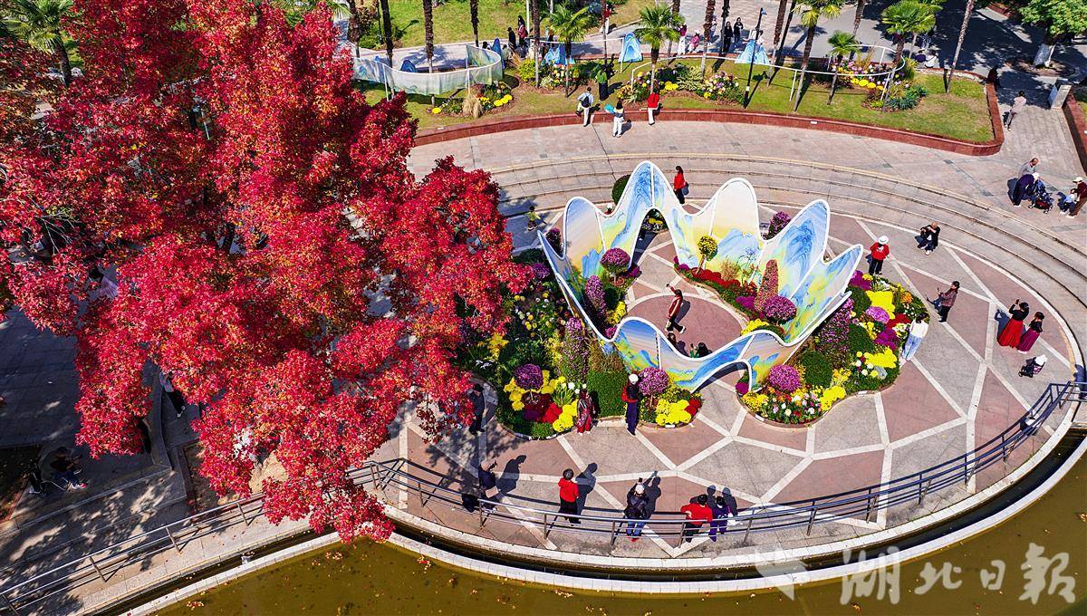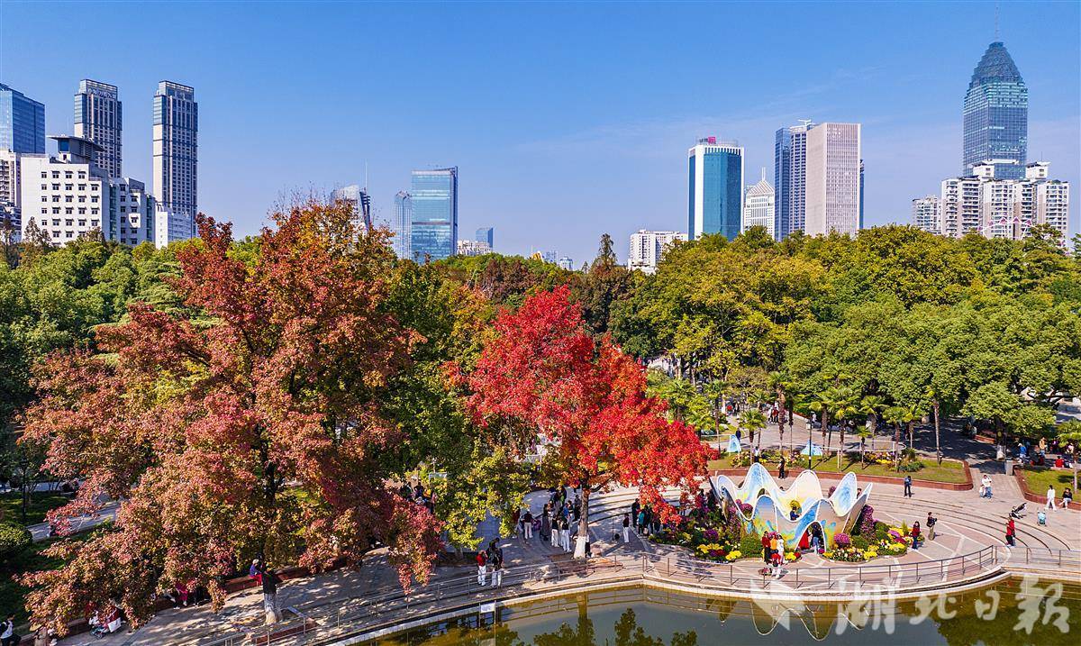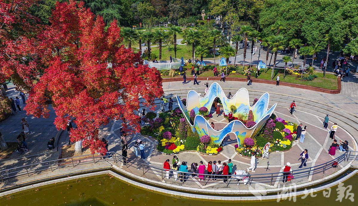11月4日,武汉中山公园喷泉池旁边的两株枫树已是一片火红,树下正举行第42届金秋菊展,许多游客和市民来到这里拍照游玩。有网友称:中山公园不仅是武汉闹市之中的“绿宝石”,而且也是武汉闹市之中秋天的“调色板”,枫叶红了,武汉的秋天就来了。(湖北日报全媒记者 朱熙勇 摄)