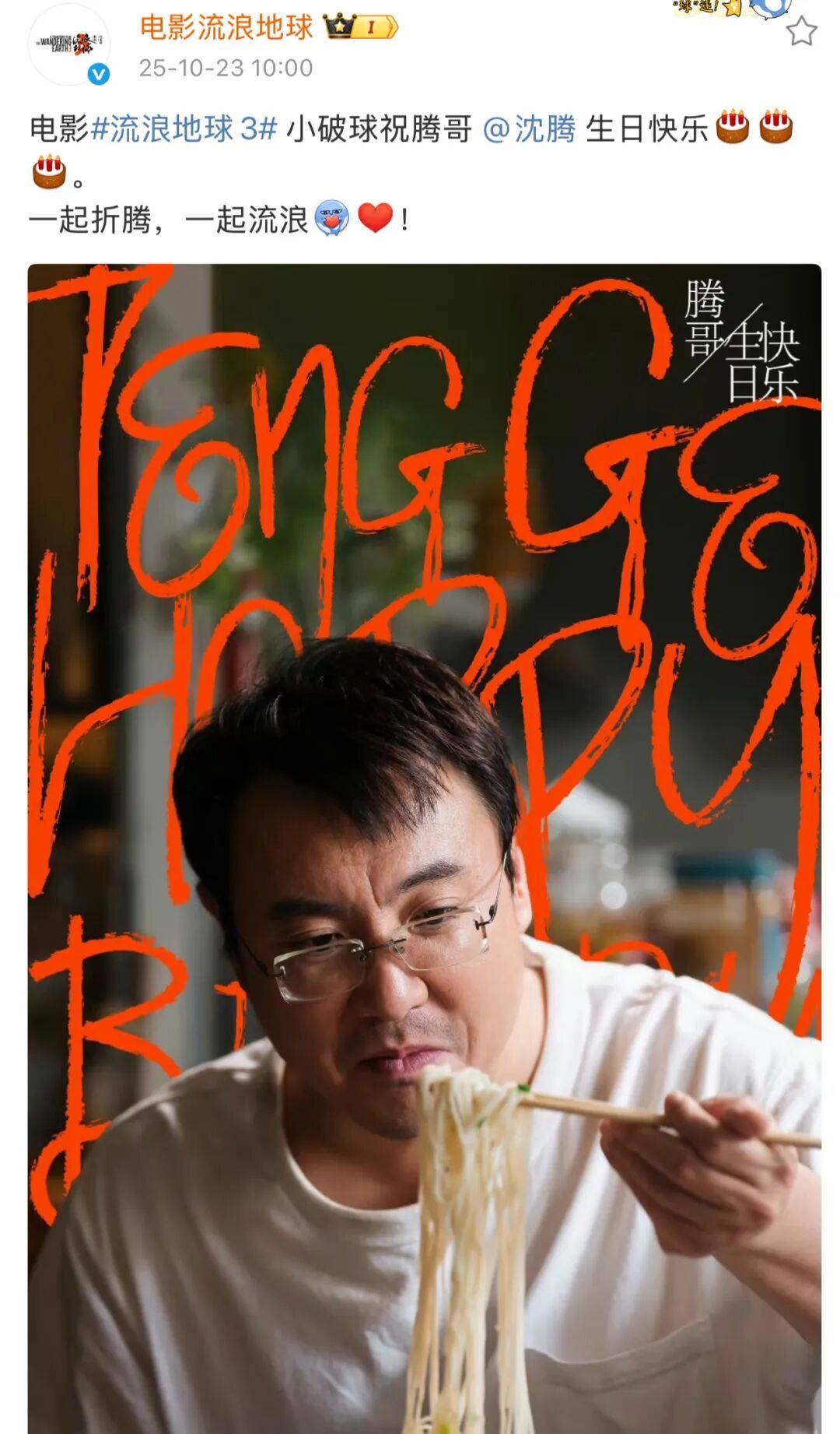 此前,10月23日,电影《流浪地球3》发布了主演沈腾的首张剧照,并祝沈腾生日快乐。剧照中的沈腾,白短袖、无框眼镜,神情专注地“吃着一碗面”。