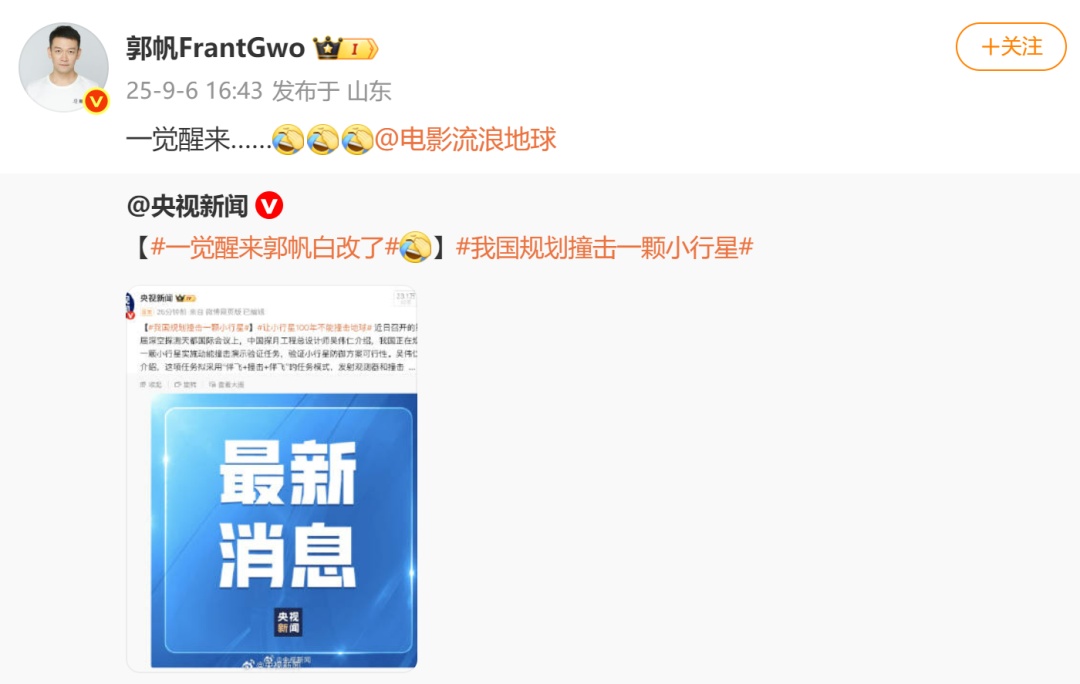 随后,央视新闻将该条“我国规划撞击一颗小行星”的动态截图再次发布,并配文“一觉醒来郭帆白改了”。