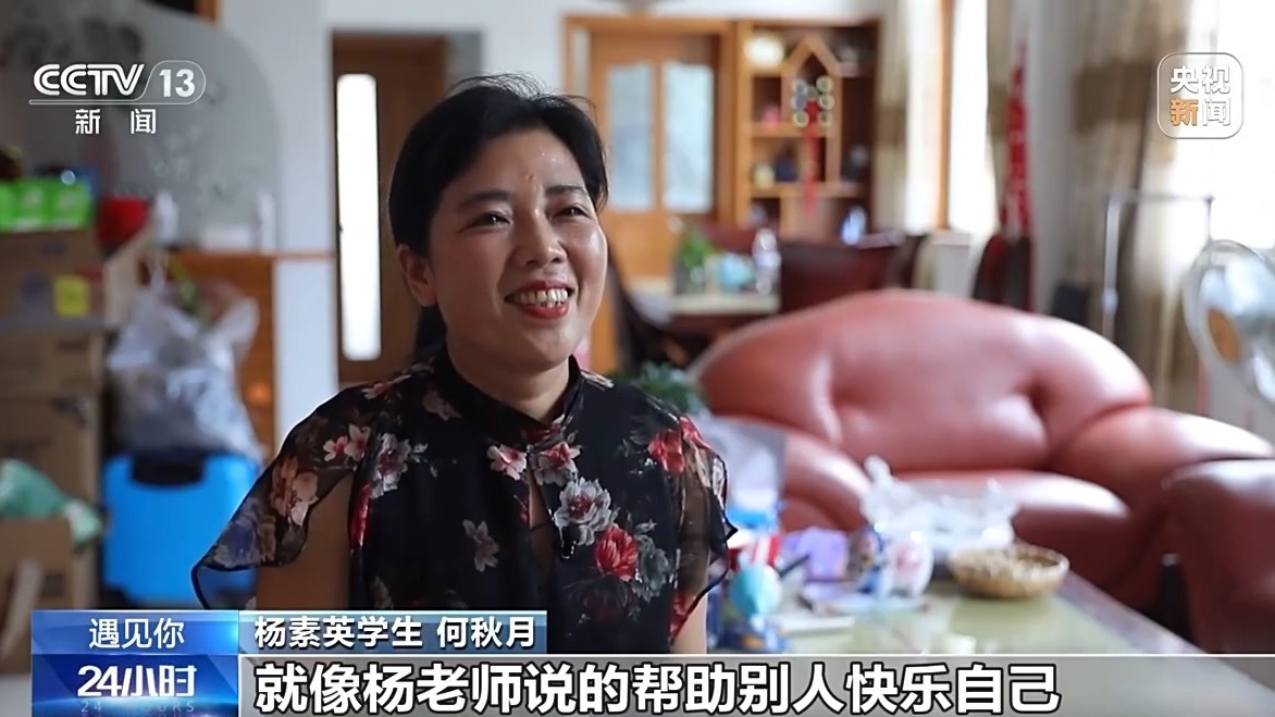 杨素英学生 何秋月:我们都是农村出来的,而且我小时候是很苦的。杨老师在做公益事业,帮助贫困生,然后我想自己现在条件好点了,我也想去帮他们一点。就像杨老师说的,帮助别人快乐自己。所以说杨老师的爱心接力棒,我想一直接下去。