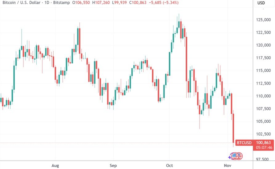 周三凌晨的最新报价显示,比特币最新盘中下跌超5%,报100,863美元,一度触及低点99,939美元。这也是比特币自6月下旬以来首次跌破10万美元关口。