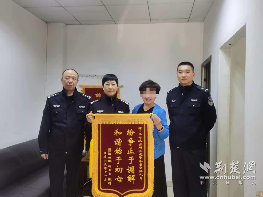 民警的调解不仅成功化解了纠纷,还修复了宝贵的邻里关系。11月3日,陈女士将一面写有“纷争止于调解,和谐始于初心”的锦旗赠予二七所,向民警表示感谢。