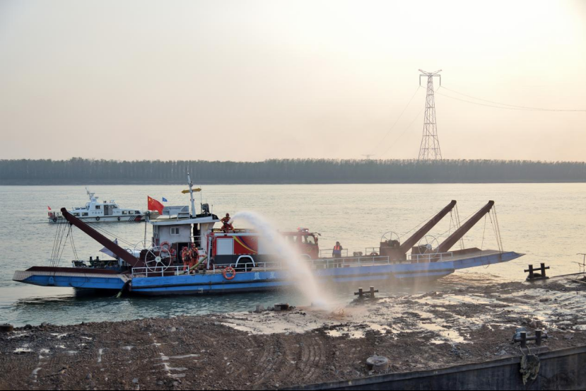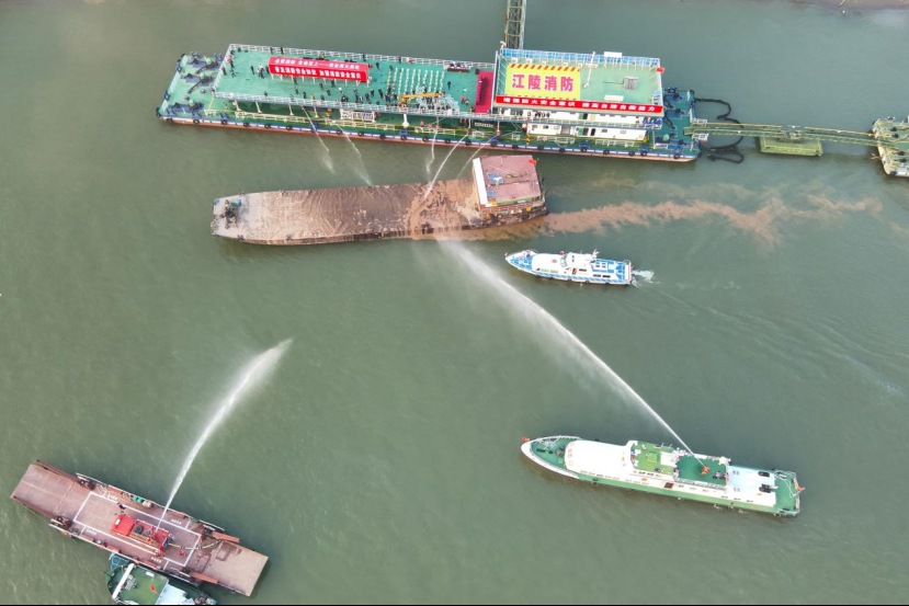 演练模拟一艘装载大量成品尿素的运输船航行至江陵段水域时,船员吸烟不慎引燃杂物间,火势快速蔓延并产生大量浓烟,2名船员被困,且船只距离水上加油站仅30米,险情万分紧急。随着总指挥一声“演练正式开始”,各参演单位迅速响应,一场多维度、全流程的应急救援行动即刻展开。