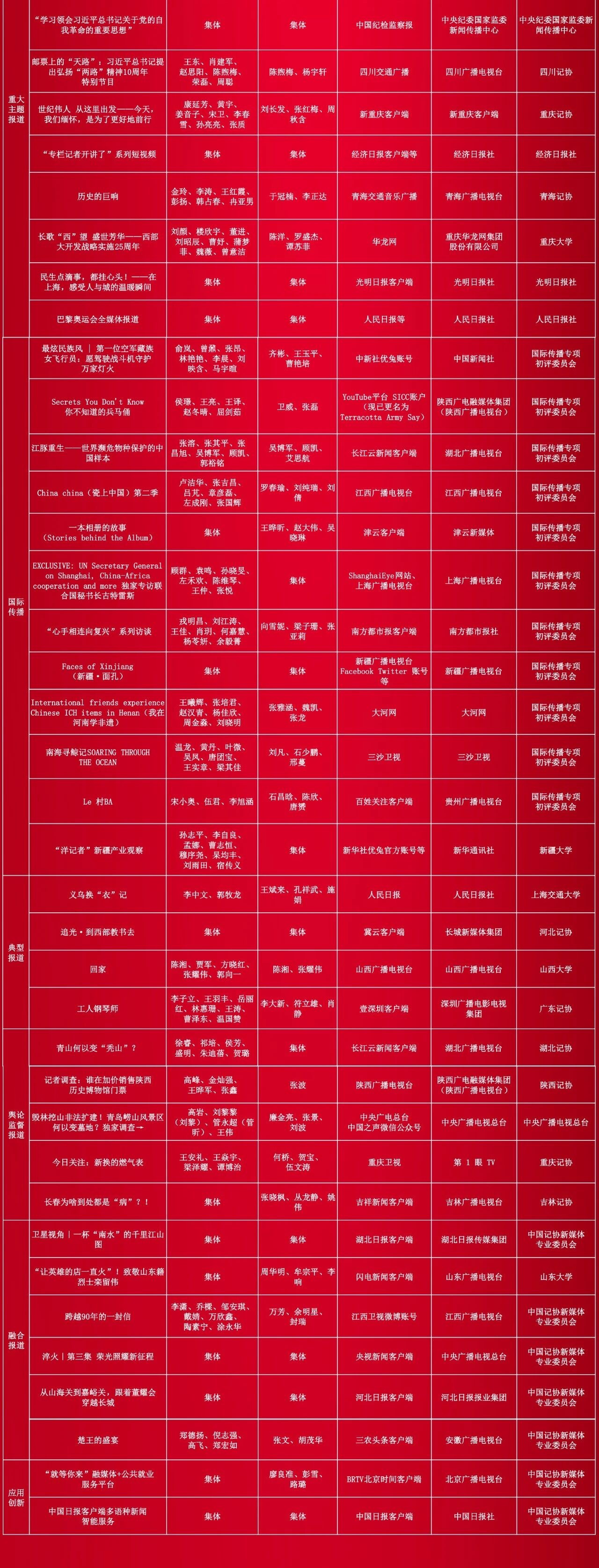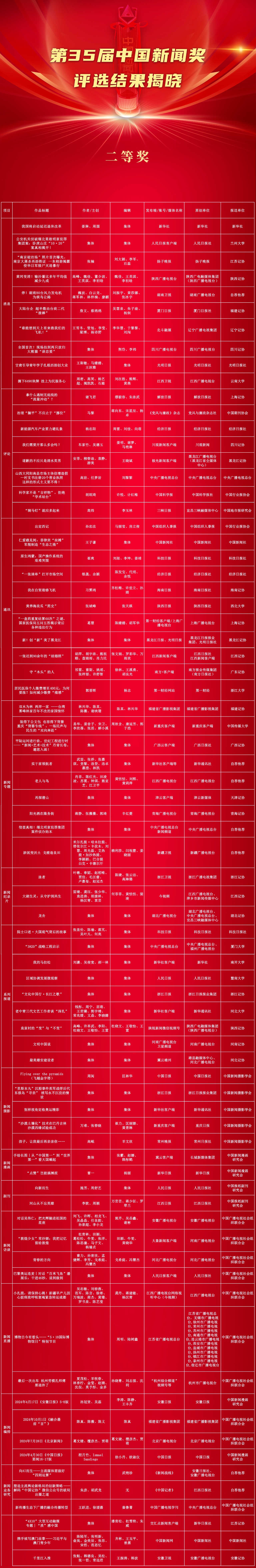 由中华全国新闻工作者协会主办的第35届中国新闻奖评选结果于11月5日揭晓。来自各级各类媒体的377件作品获中国新闻奖,其中,特别奖4件、一等奖74件、二等奖113件、三等奖186件。