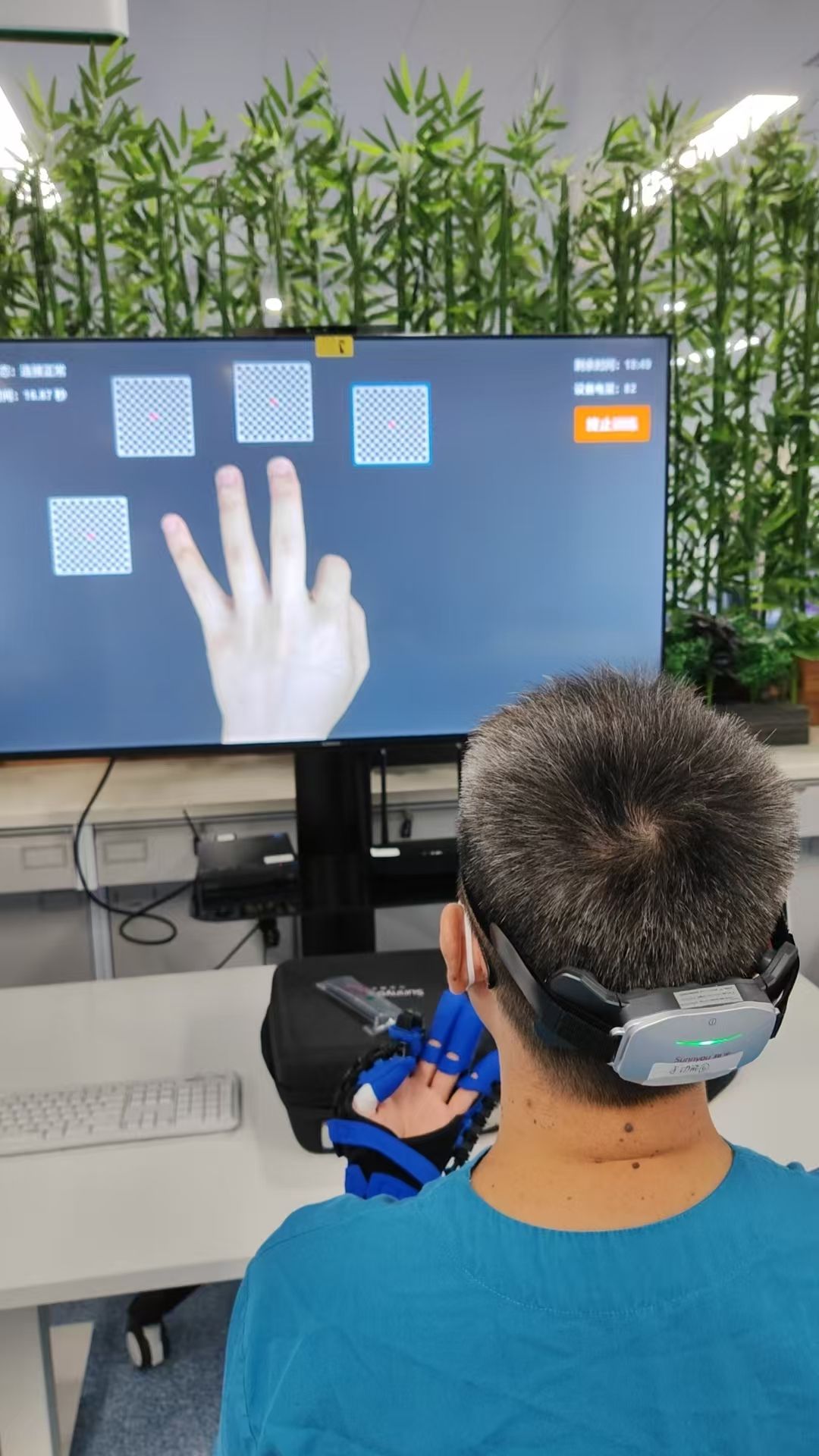 仪式结束后,与会人员移步至医院康复治疗中心的脑机接口作业治疗区,一位男性患者头戴轻便的无创脑电帽,脑机交互手功能康复机器人精准捕捉着他每一丝神经信号。他凝神注视屏幕上的虚拟手——几秒后,机械手套应声而动,而他的手指也随之抓握起来。