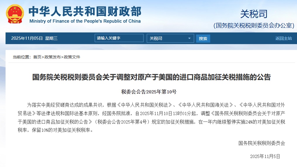 为落实中美经贸磋商达成的成果共识,根据《中华人民共和国关税法》、《中华人民共和国海关法》、《中华人民共和国对外贸易法》等法律法规和国际法基本原则,经国务院批准,自2025年11月10日13时01分起,调整《国务院关税税则委员会关于对原产于美国的进口商品加征关税的公告》(税委会公告2025年第4号)规定的加征关税措施,在一年内继续暂停实施24%的对美加征关税税率,保留10%的对美加征关税税率。