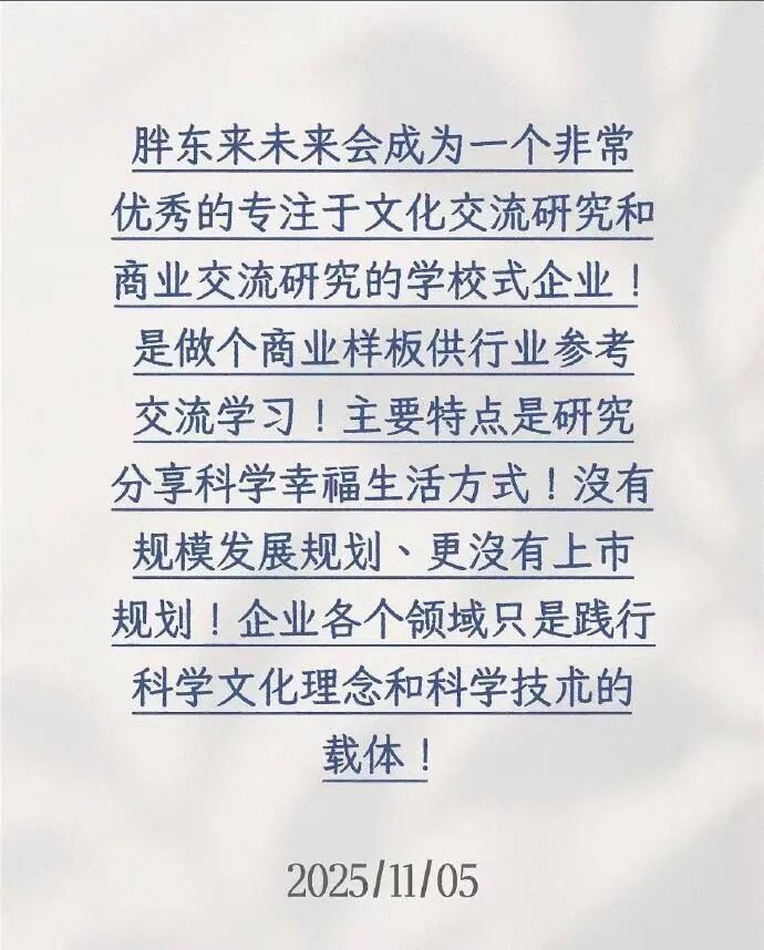 11月5日,胖东来创始人于东来在社交平台发文:胖东来未来会成为一个非常优秀的专注于文化交流研究和商业交流研究的学校式企业。没有规模发展规划、更没有上市规划。