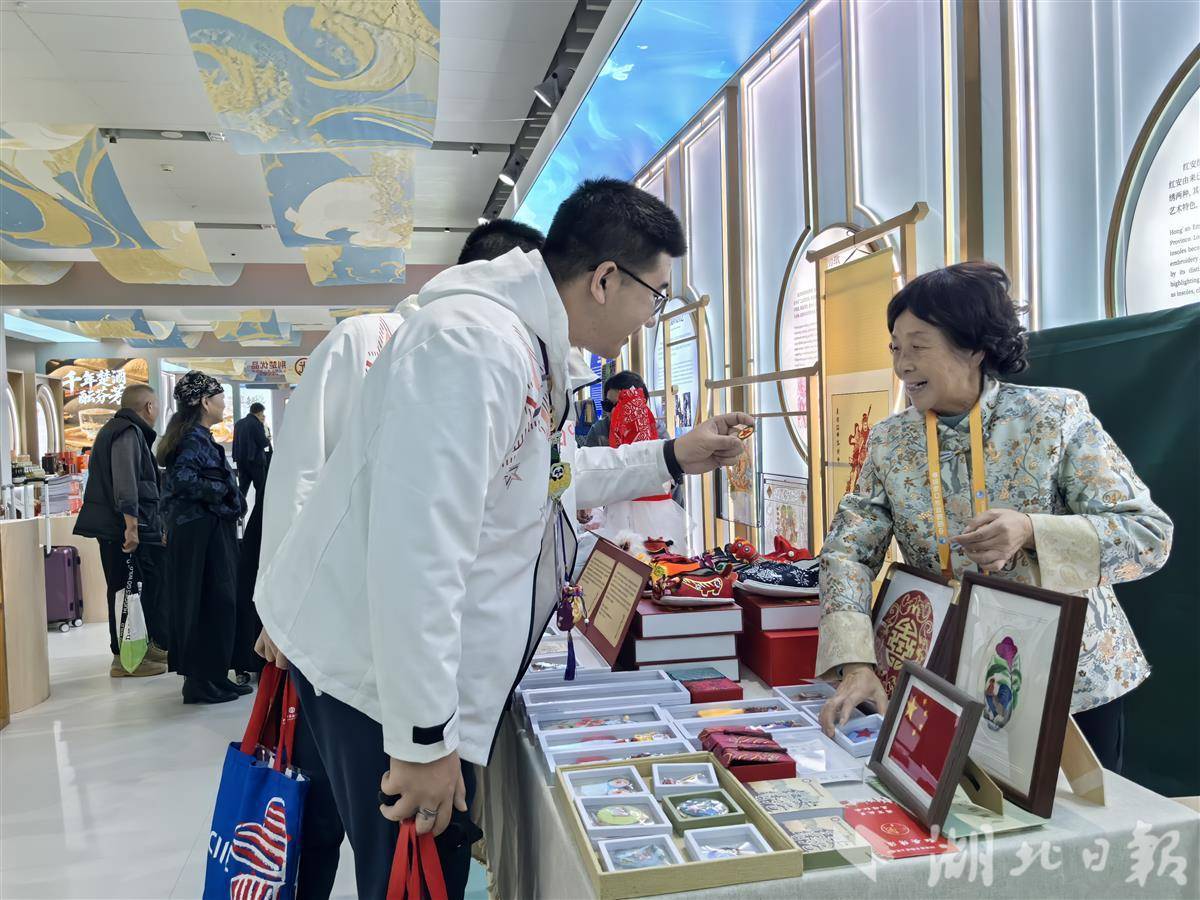 第四邀:技艺之邀——来自湖北各地区的30位省级非遗技艺传承人,带来的武汉剪纸、山风核雕、襄阳香包、峡江草编等传统非遗项目轮番亮相,让观众带件湖北“绝活”回家。年近七旬的“红安绣活”非遗技艺传承人刘寿仙笑容灿烂,她缝制的红安绣花鞋垫、童鞋、饰品精美别致,不少客商现场下单。