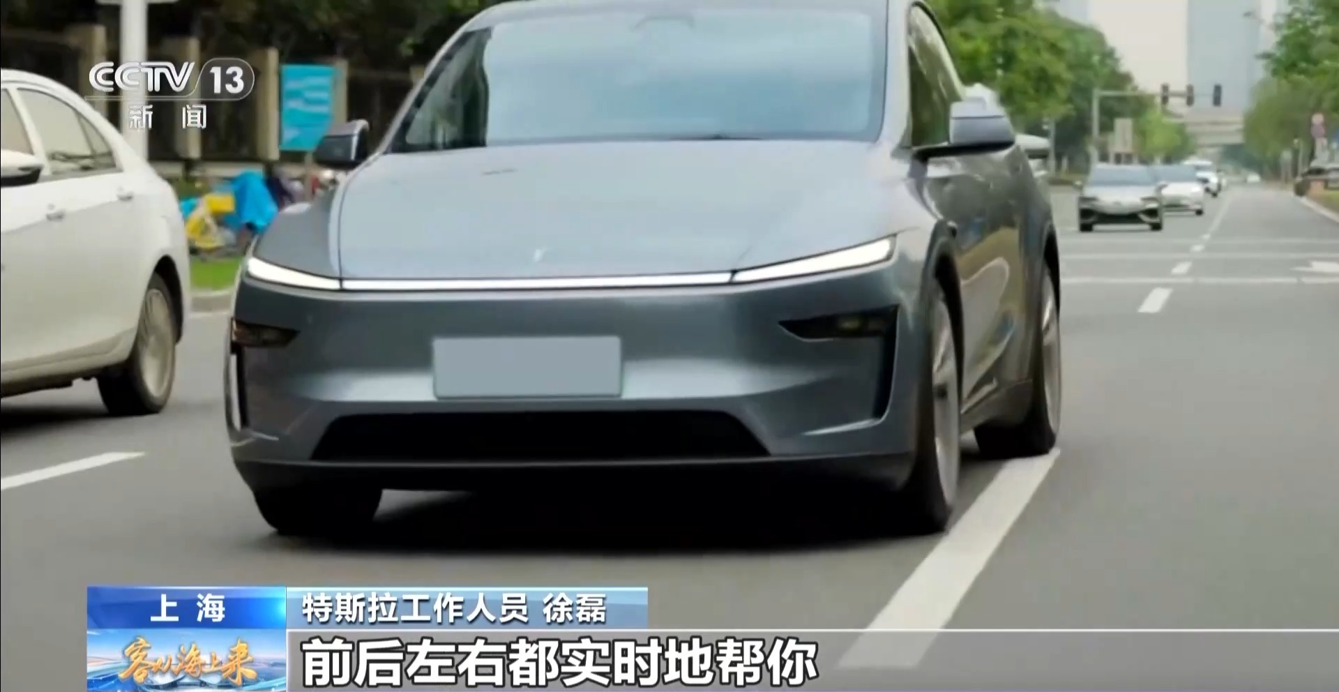 特斯拉工作人员 徐磊:首先可以做一个无图的智能辅助驾驶。人靠一双眼睛来开车,这台车有八只眼睛,前后左右都实时地帮你去监视周围的情况。