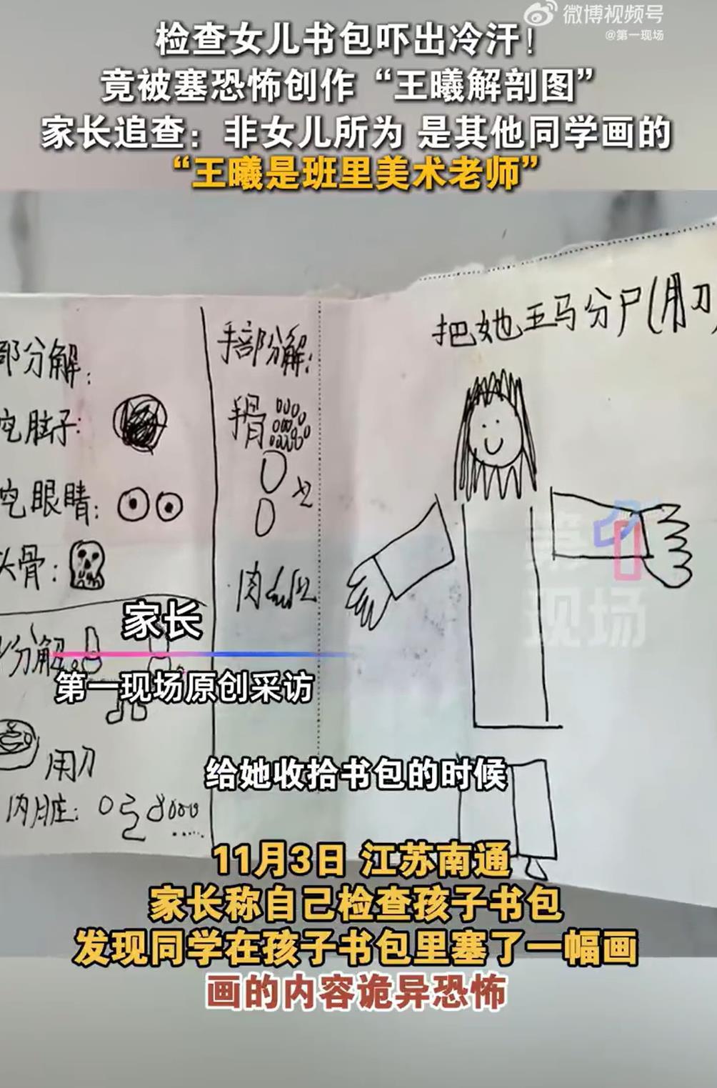 11月3日,江苏南通一位家长检查女儿书包时,发现一张内容诡异的手绘解剖图,标注着“王曦解抛(剖)图”,含“用刀分解”“挖眼睛”“抽血”等步骤描述。