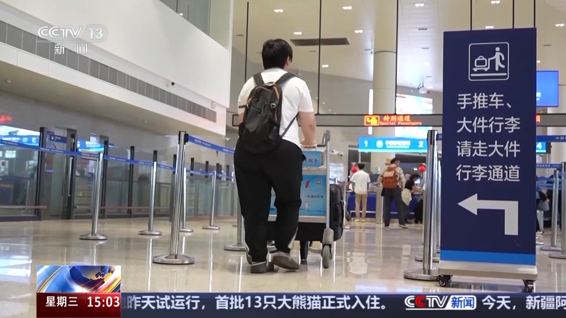 出境查验大厅内,林慧娟推着行李车走向“大件行李通道”。这条专用通道,让携带大件行李的旅客能够快速通行,排队时间从过去的20分钟缩短到现在不到5分钟。