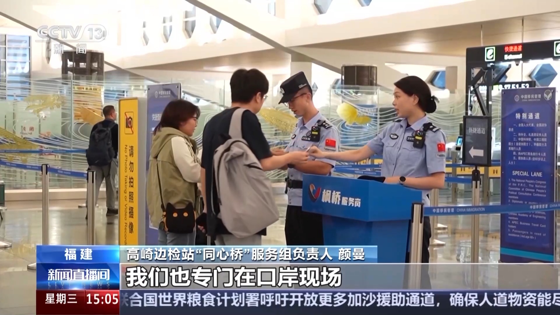高崎边检站“同心桥”服务组负责人 颜曼:为了进一步提升往来台胞的通关体验,我们在口岸现场设置了枫桥咨询岗,第一时间为出入境台胞提供政策指引。同时,在采集备案区及快捷通道区域,也安排了民警为台胞高效通关提供引导帮扶,真正实现台胞即到即检、一路畅通。
