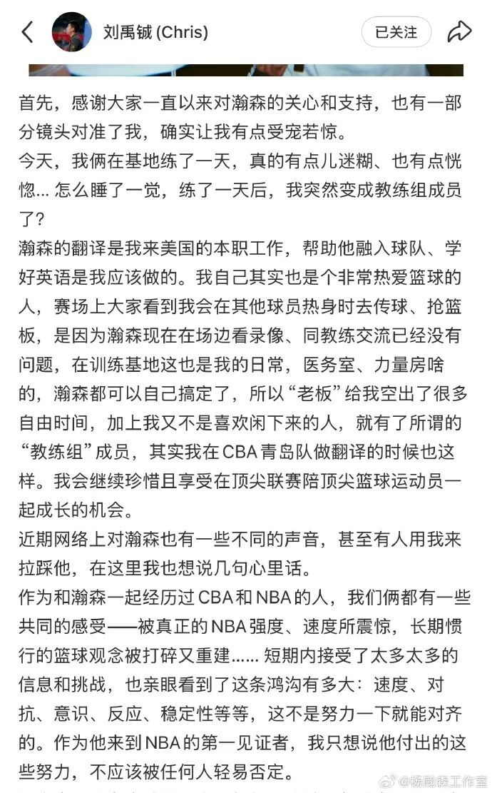 据此前报道,近日,有关NBA波特兰开拓者队球员杨瀚森的翻译“加入球队教练组”的传闻引发关注。对此,杨瀚森的随行翻译刘禹铖在个人社交媒体上发文澄清,表示自己的主要工作仍是协助杨瀚森在美国的生活与训练,帮助他更好地适应球队环境、提高英语能力。