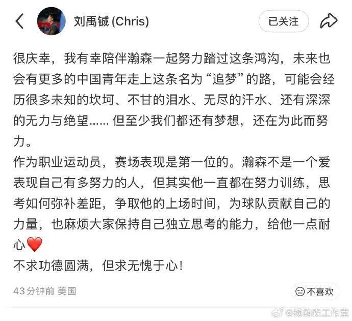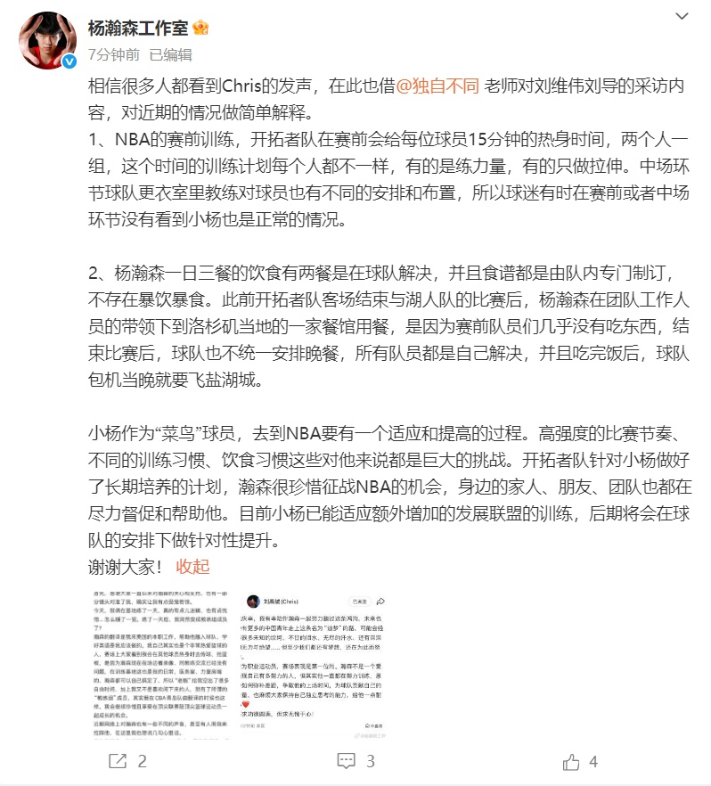 11月5日,杨瀚森工作室发文回应近期争议:
