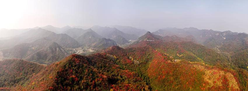 当日早晨,登上山顶放眼望去,秋色如同浓墨重彩的画笔,将连绵的山峦渲染得五彩斑斓,每一片红叶都在阳光下竞相绽放其最热烈的色彩。