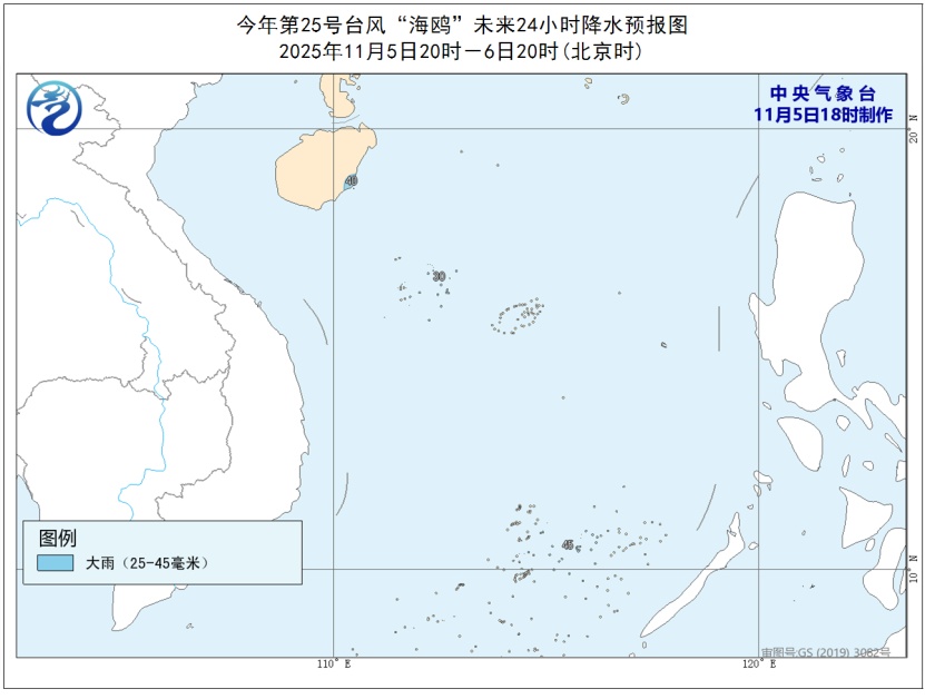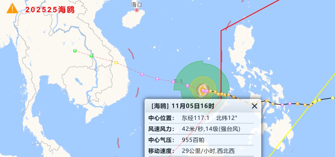 海南省气象局2025年11月5日17时30分继续发布台风四级预警(海上),请三沙市各岛礁做好在港船只及岛礁设施、人员安全防范工作,南海中部和南部海域作业的海上平台和船只继续做好避风措施。