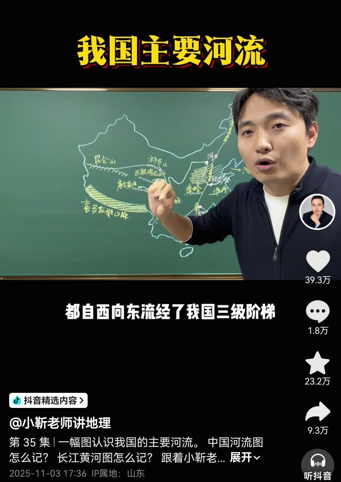 “一幅图带大家认识我国的主要河流!”11月3日,抖音博主“小靳老师讲地理”一条讲述我国主要河流的视频涨粉10.4万,加上其他几条系列视频,涨粉超20万,有网友称其为“手绘地图打印机”。11月5日,小靳老师回应极目新闻记者,近20年来他深耕地理专业,很欣慰能够将精彩的课堂不断地分享出去,让更多的人受益。
