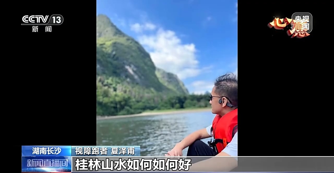 视障跑者 夏泽甫:今年9月21日又跟文老师去了一趟桂林,我第一次感受那种竹筏,感受一下漓江,以前小时候课文上写的桂林山水如何如何好,我没去过,就去感受一下。