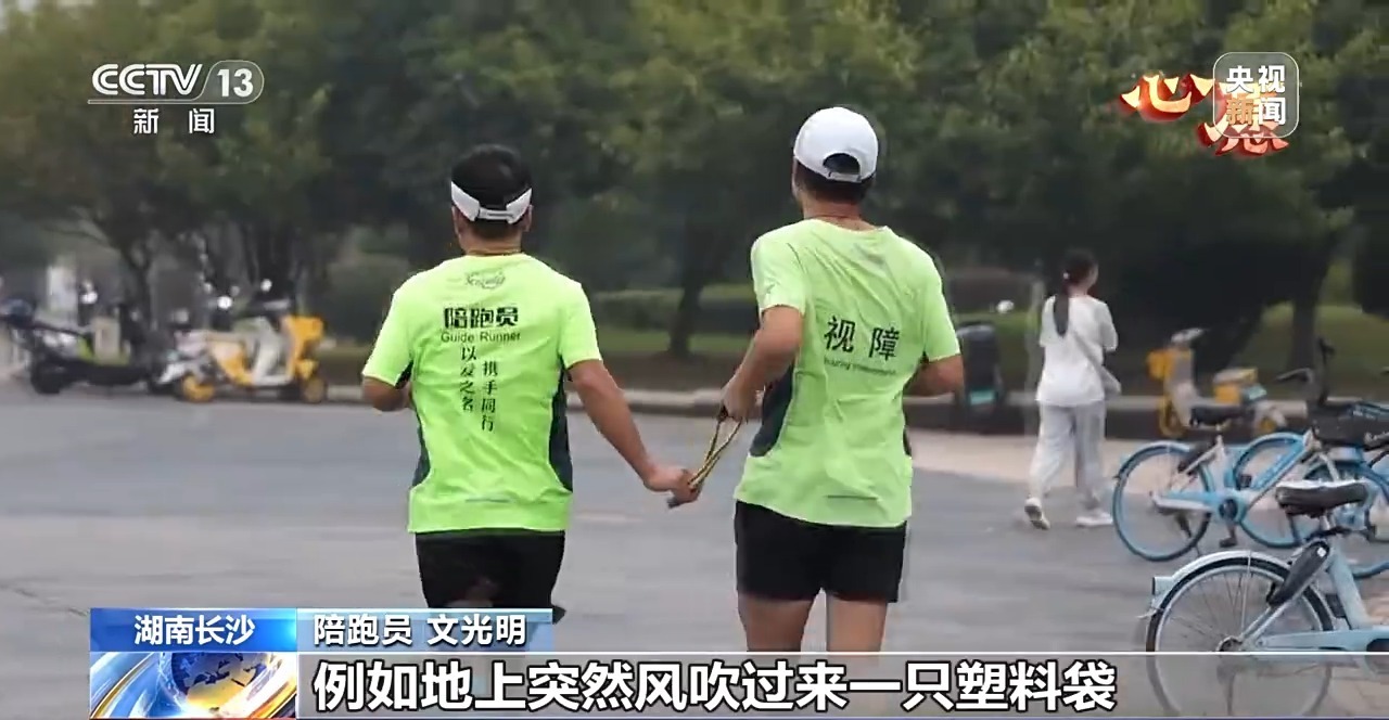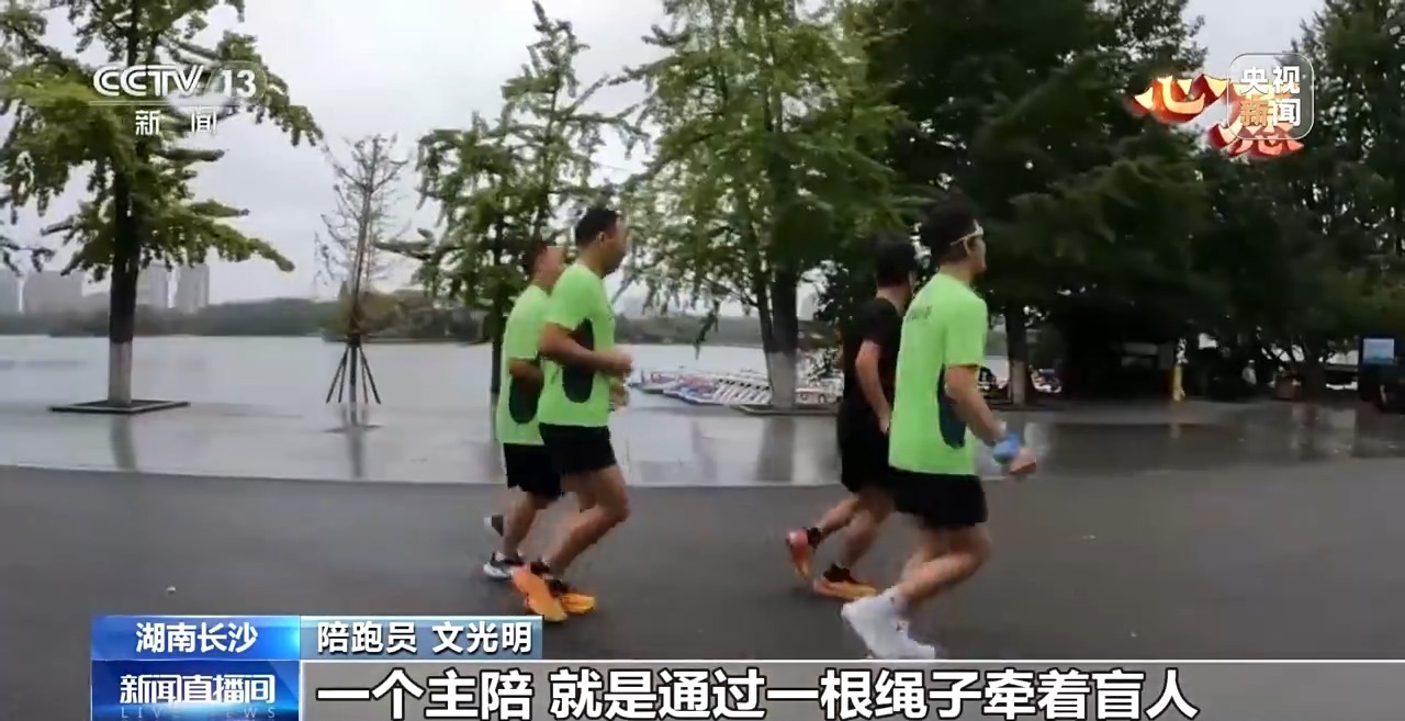 清晨七点多,在湖南长沙烈士公园,晨跑的人三三两两。但有两个人不一样,他们没有耳机,也不看表,并肩而行。中间还有一根不到五十厘米的绳子,轻轻牵着。他们就是文光明及视障跑者夏泽甫,两人一边跑一边聊,步伐平稳。