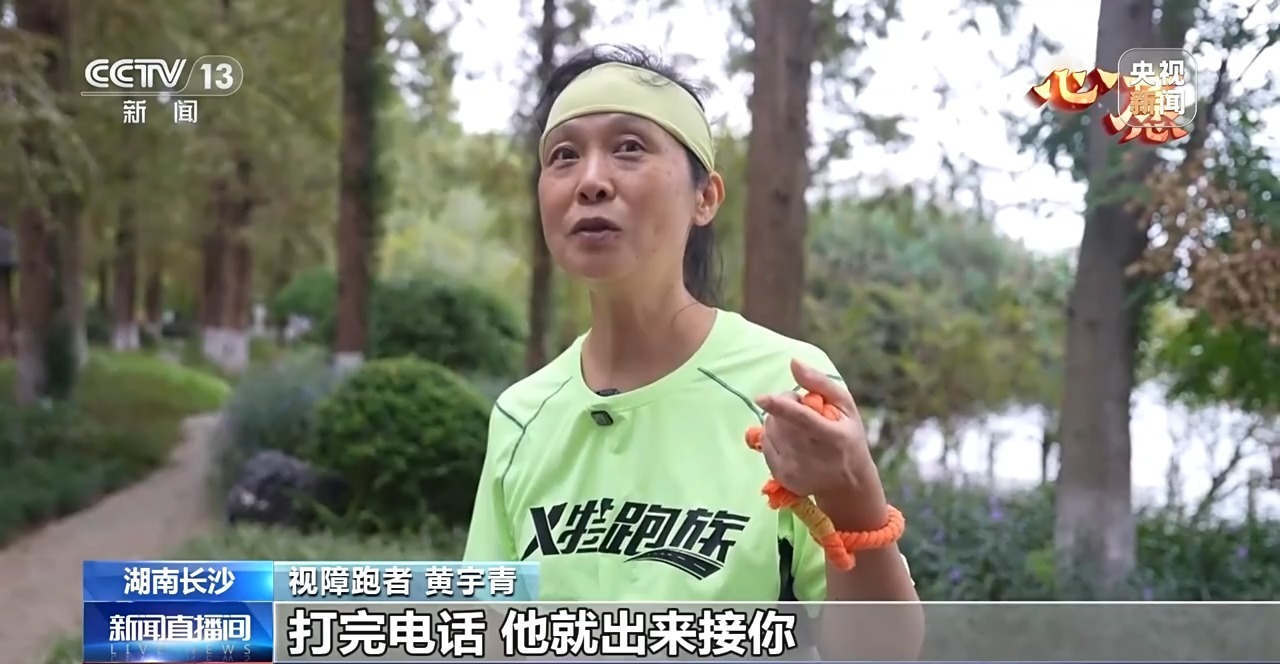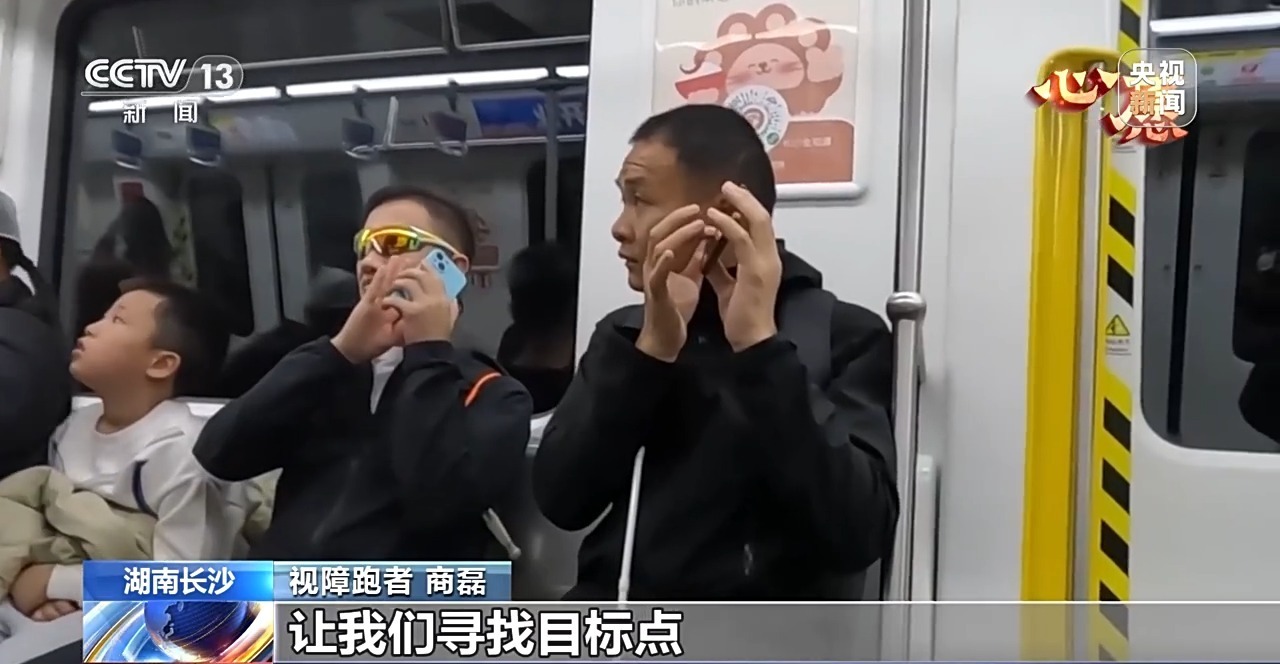 视障跑者 黄宇青:下了公交车就可以打地铁的电话,打电话以后他就出来接你,到站以后,另外一个站的又可以直接把你送出地铁口,对我们来说跑步的整个流程都衔接起来了。