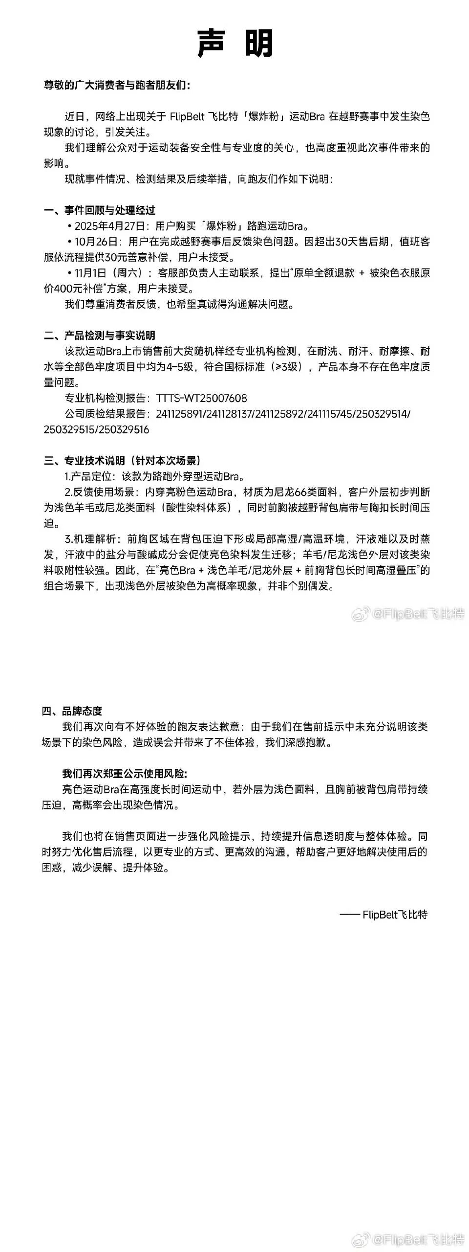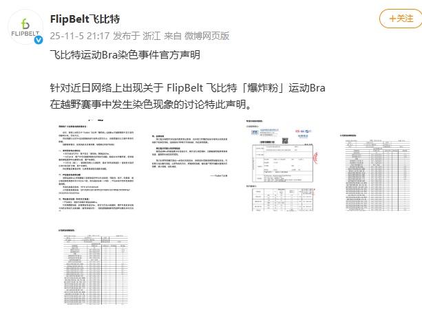 近日,网络上出现关于 FlipBelt 飞比特「爆炸粉」运动Bra 在越野赛事中发生染色现象的讨论,引发关注。现就事件情况、检测结果及后续举措,向跑友们作说明: