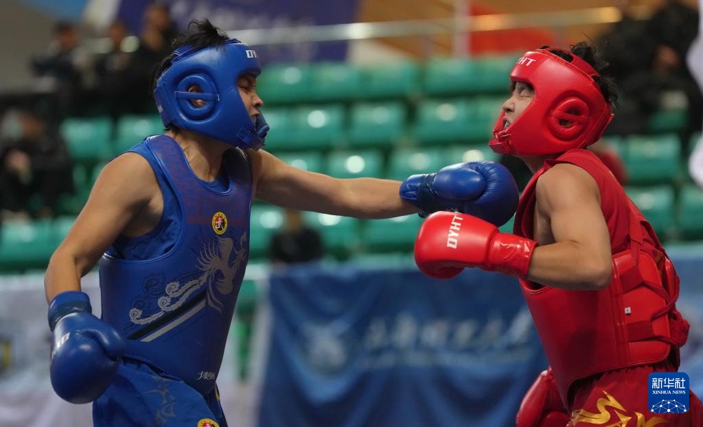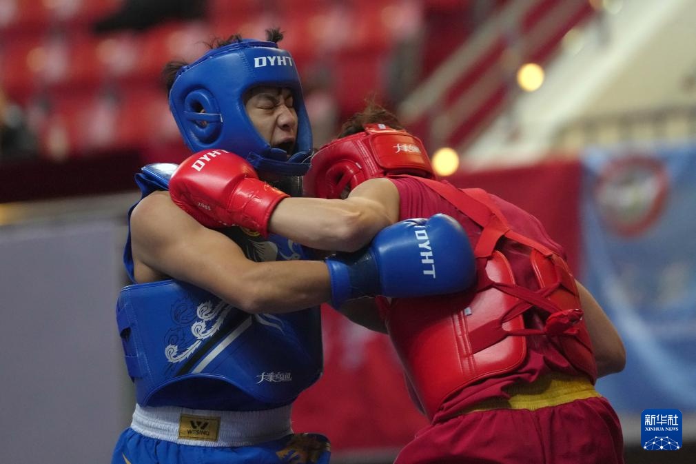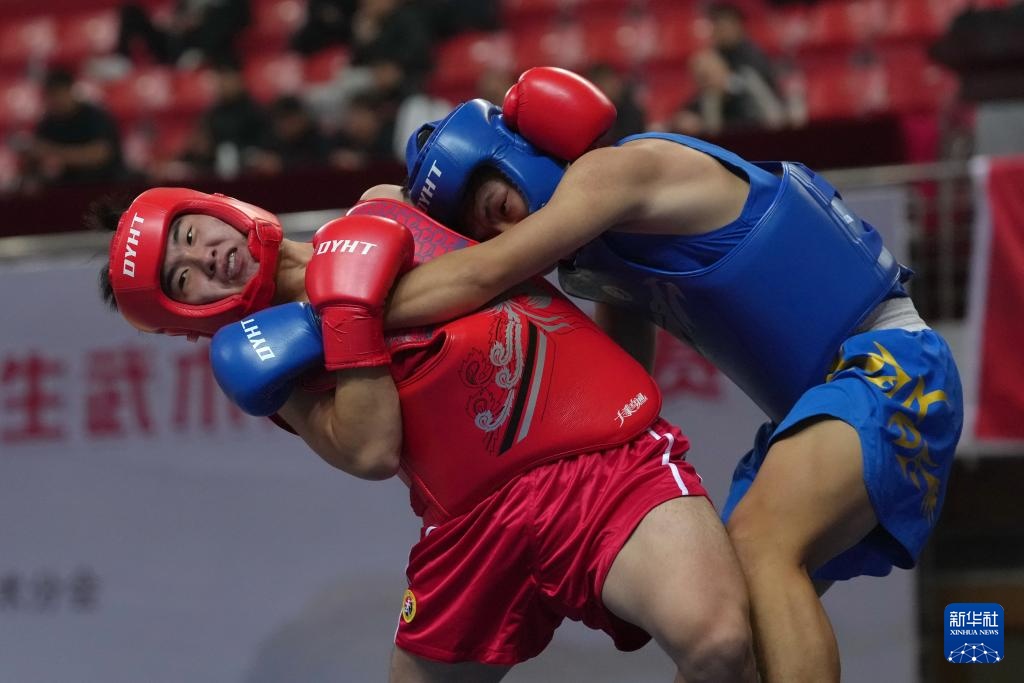 11月5日,嵩山少林武术职业学院选手王世超(左)与重庆工程职业技术学院选手杜俊杰在男子乙A组64公斤级比赛中。最终,王世超战胜杜俊杰,晋级决赛。