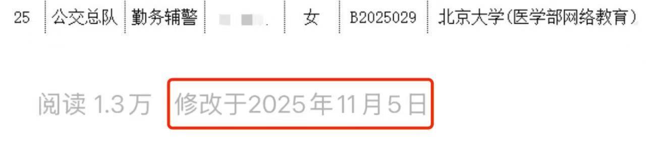 据媒体此前报道,10月31日,“中安卫士北京”公众号公示了北京市公安局公交总队2025年11月份拟聘用勤务辅警名单,共80人。这份名单附带了拟聘用勤务辅警的毕业院校信息,其中出现北京大学、中国科学院大学、中国政法大学等名校。11月5日晚,“中安卫士北京”公众号使用修改功能,对以上图片进行了修改。原“北京大学”的信息,被改为“北京大学(医学部网络教育)”。6日上午,记者注意到,上述公告已不再显示。