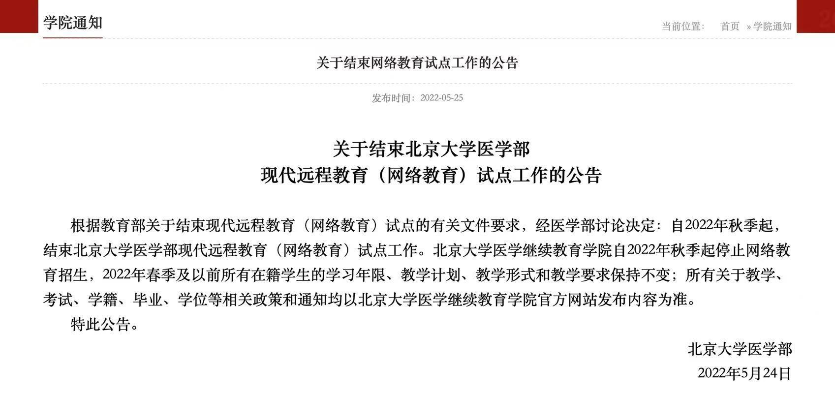 公开资料显示,北京大学(医学部网络教育)隶属北京大学医学继续教育学院,2022年春季招生简章显示招生专业为护理学(专升本)以及药学(专升本),此专业为现代远程教育的一种。不过,北京大学医学部已于2022年5月24日,发布了一则“关于结束北京大学医学部现代远程教育(网络教育)试点工作的公告”。根据教育部关于结束现代远程教育(网络教育)试点的有关文件要求,经医学部讨论决定:自2022年秋季起,结束北京大学医学部现代远程教育(网络教育)试点工作。