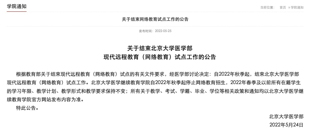 据了解,网络教育属现代远程教育一种。2022年,北大医学部已发出公告,停止网络教育招生。而北京大学早在2018年就停止了现代远程教育招生。