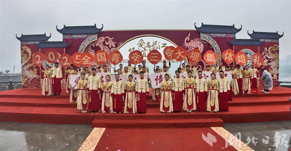 11 月 6 日,“爱满长江 情定宜昌” 2025全国青年三峡大坝集体婚礼在三峡大坝截流纪念园举办。24对来自全国各地各行各业的新人,身着中式礼服完成三拜之礼、互换戒指、共饮柑橘合卺茶等传统仪程,携手走过三峡大坝水电工程模型桥梁。