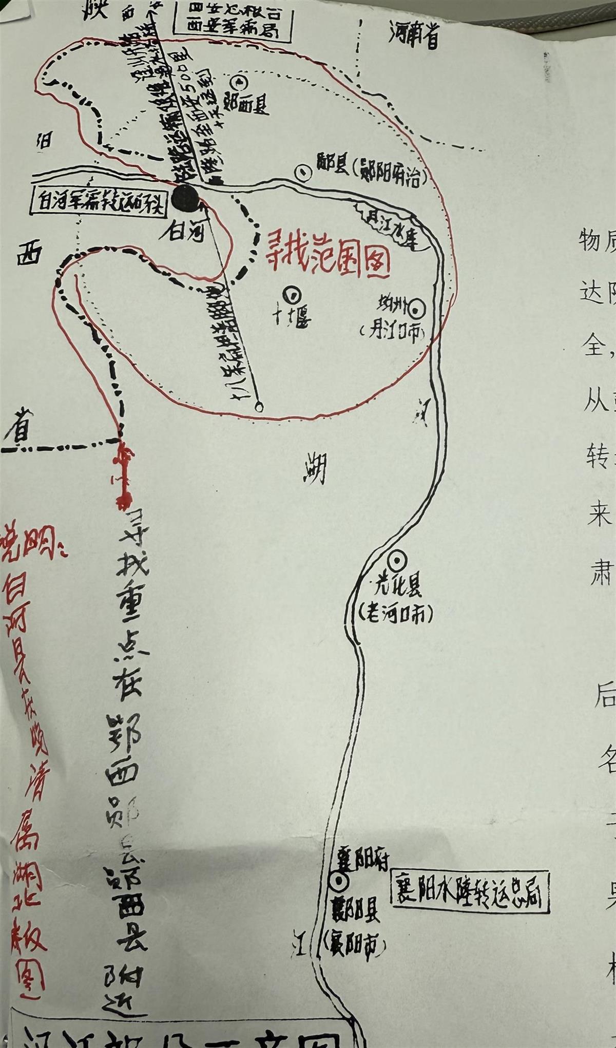 郑用威的女儿郑丽萍告诉记者,在极目新闻发出报道后,父亲很开心,希望可以借助媒体的力量,早日找到“十八条扁担”后人。根据最近老人手绘的一张寻找范围图上,可以看到老人标注的疑似范围在今陕西省安康市白河县、湖北省十堰市、郧西县、丹江口市及周边。