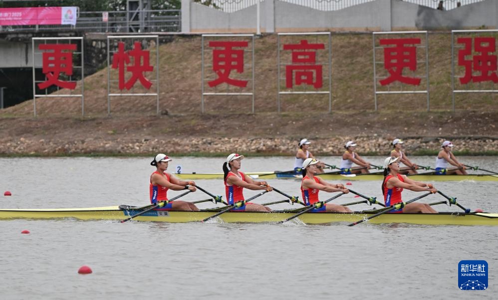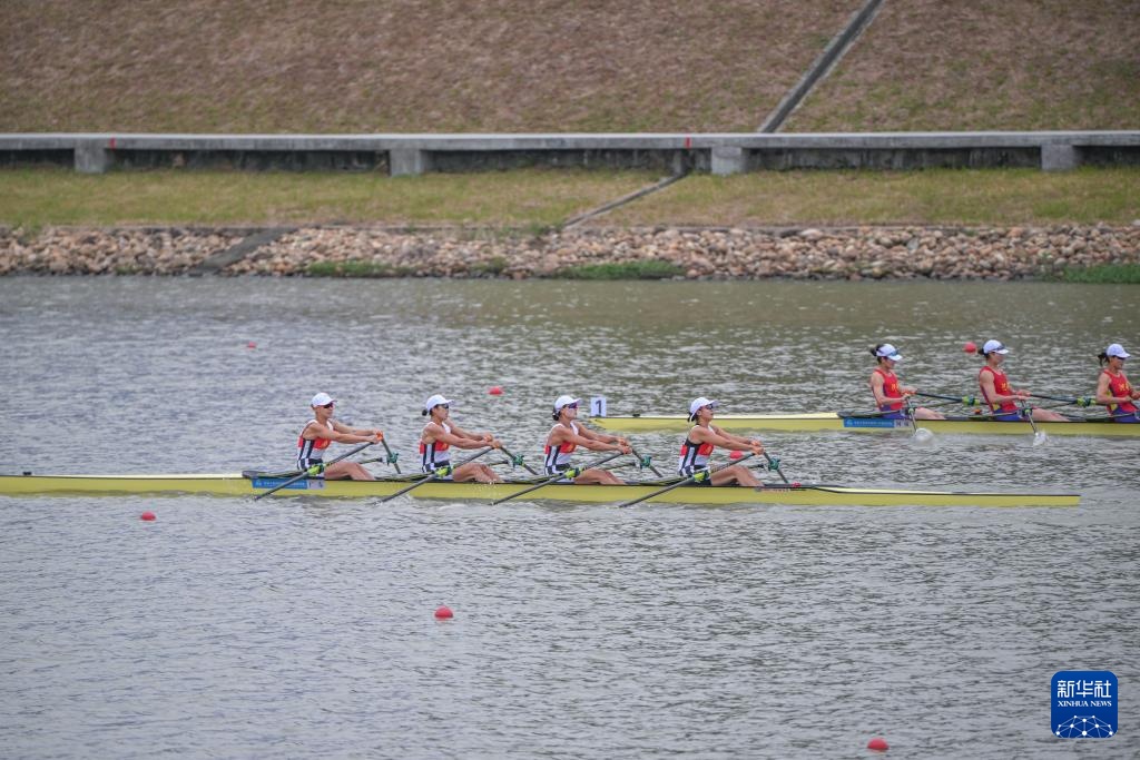 11月6日,安徽队(前)在女子四人双桨预赛中。最终,她们晋级半决赛。