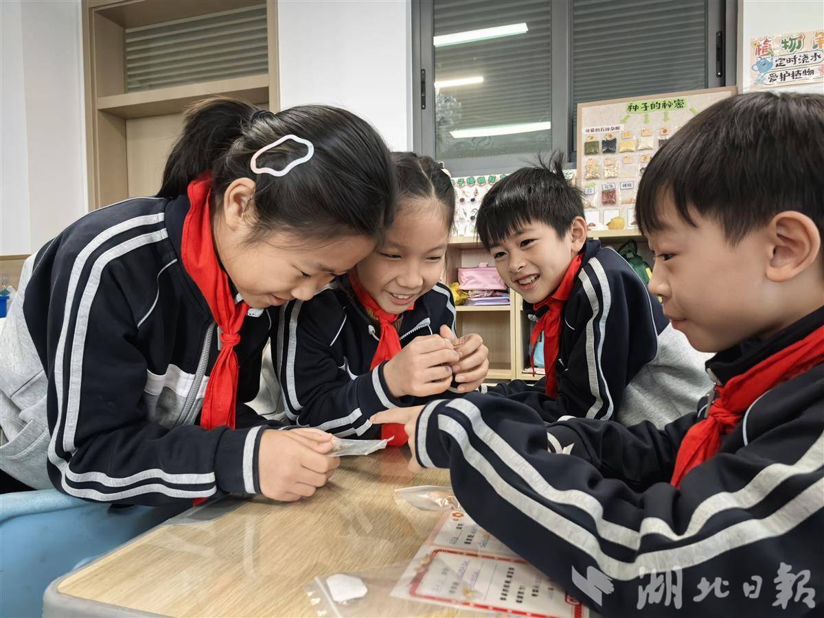 在四年级教室,一座座由学生建立的“种子银行”刚刚“开业”。孩子们将收集来的红豆、枣核、小米等种子分门别类,制作信息卡,用眼睛看、用手摸、用耳朵听。“红豆外表光滑,落在桌上会发出清脆的响声”“枣核底部圆圆的,上头尖尖的”……他们细致的观察里,满是对生命的好奇。