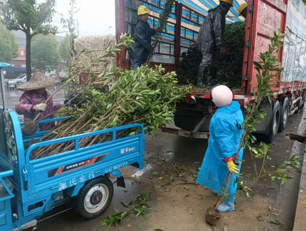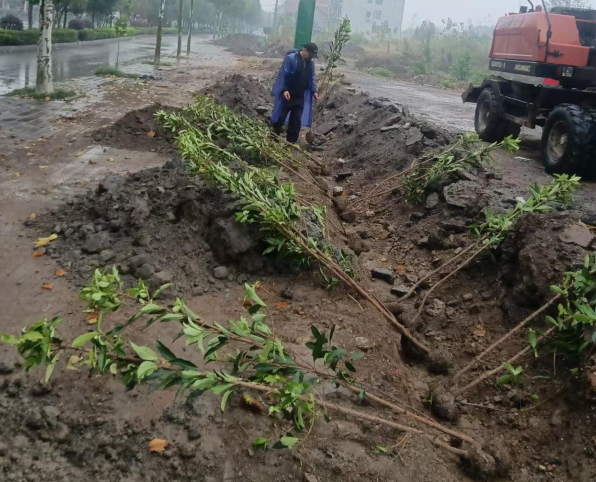清运告捷后,绿化工程立即无缝衔接。尽管雨势不断,计划栽种4000棵法国冬青的工作仍在紧张有序推进。工作人员身着雨具,克服地面湿滑等困难,精准进行苗木栽植。一株株新绿在细心地安置下扎根土壤。