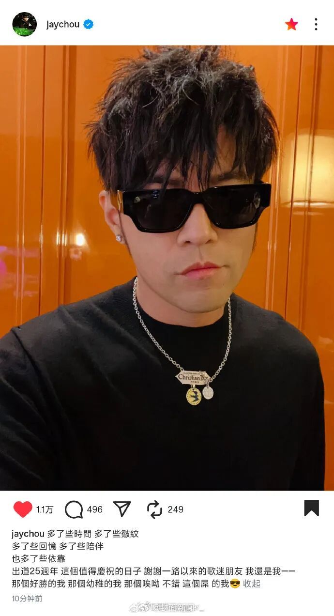 11月6日,周杰伦出道25周年发文:“多了些时间,多了些皱纹,多了些回忆,多了些陪伴,也多了些依靠。出道25周年,这个值得庆祝的日子,谢谢一路以来的歌迷朋友。“他表示,他还是从前那个他,没有改变。