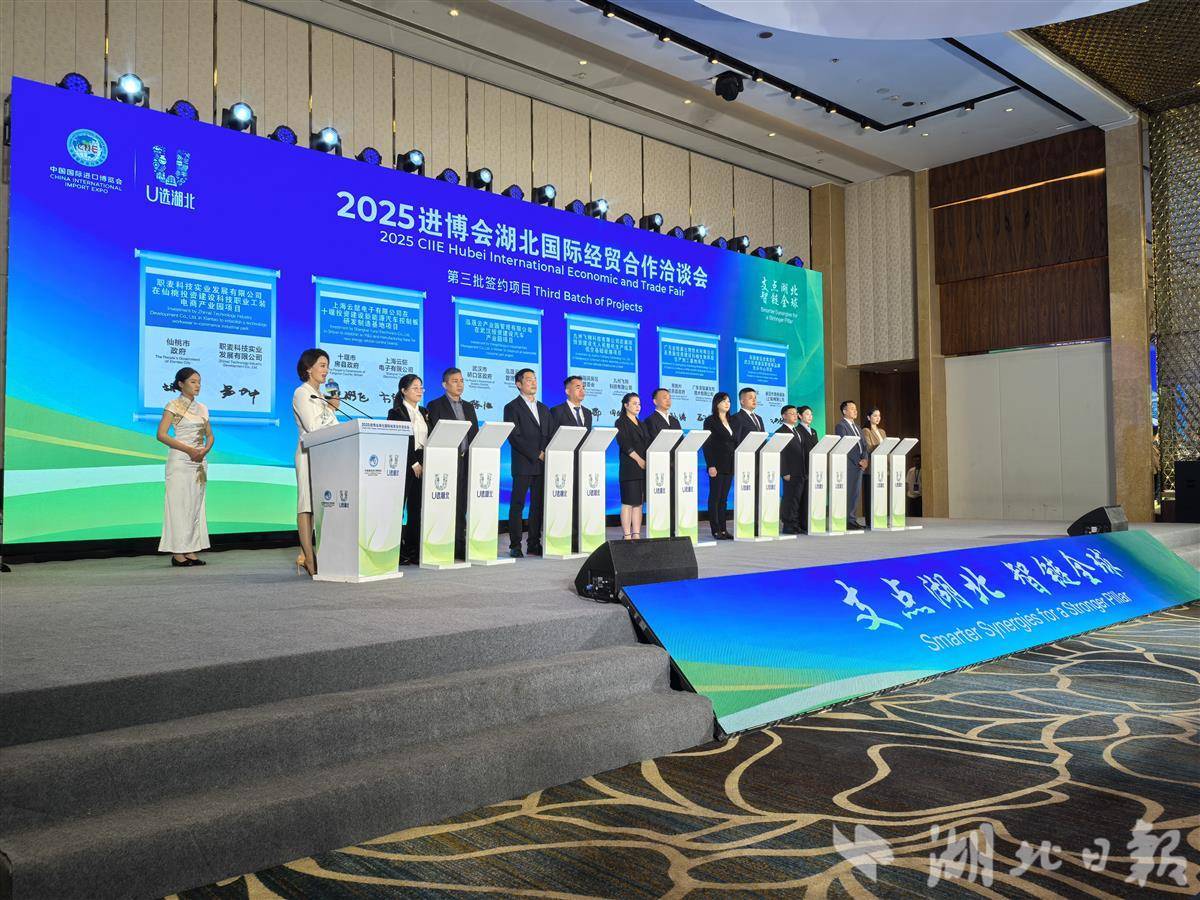 湖北日报讯(记者刘天纵、李朝霞、王艳华)五洲客商聚进博,荆楚门户迎天下。11月5日,第八届中国国际进口博览会开幕。当日下午,2025进博会湖北国际经贸合作洽谈会在上海举行,一批重点合作项目集中签约,涉及汽车制造、新材料、新能源、低空经济、光电子信息、生物医药、现代物流、现代化工等多个产业领域,共同奏响“支点湖北 智链全球”的华美乐章。