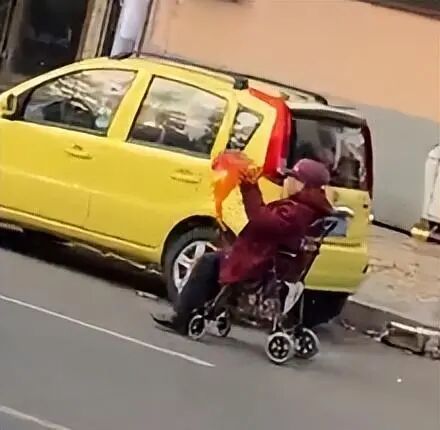 视频显示,一位头发花白的老太穿着红色棉袄,处于马路中央的双实线附近,时而坐在轮椅上,时而又能站立起来,手中挥舞着一块手帕,在道路中间旋转、跳舞,致使路过车辆被迫纷纷减速、紧急避让,多辆小车被逼停。