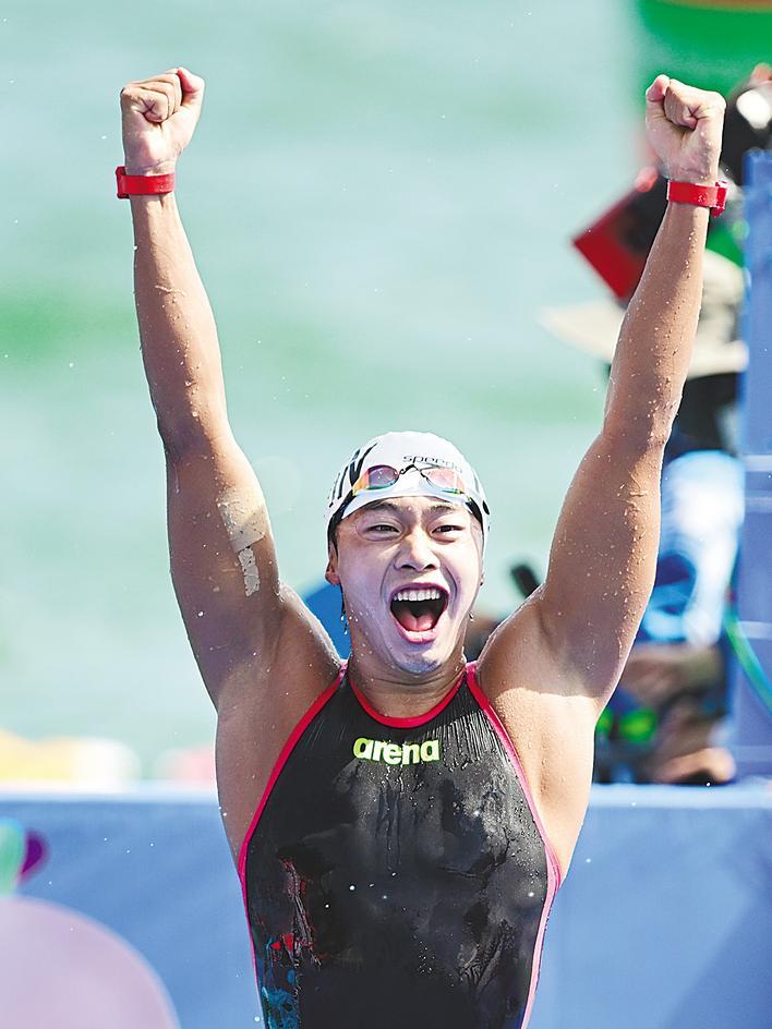 起水上岸,他高举双臂庆祝胜利,激动地与教练组成员紧紧相拥。这一刻,压力完全释放,泪水肆意流淌。“和静水湖域相比,海域马拉松的难度大了很多,而且今天的浪特别大,经常看不到方向标,只能凭感觉和意志力去游。但这也是对运动员能力的考验,在教练和团队的支持和保障下,我顶住了,做到了!”