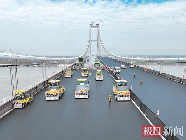 楚天都市报极目新闻讯(记者郑力强 通讯员张勇辉 李双)11月4日,随着最后一车环氧沥青混合料摊铺完成,双柳长江大桥主桥钢桥面铺装工程圆满收官。这座由湖北交投集团投资建设的横跨长江的“钢铁巨龙”,以单日铺装2.9万平方米创下世界纪录。