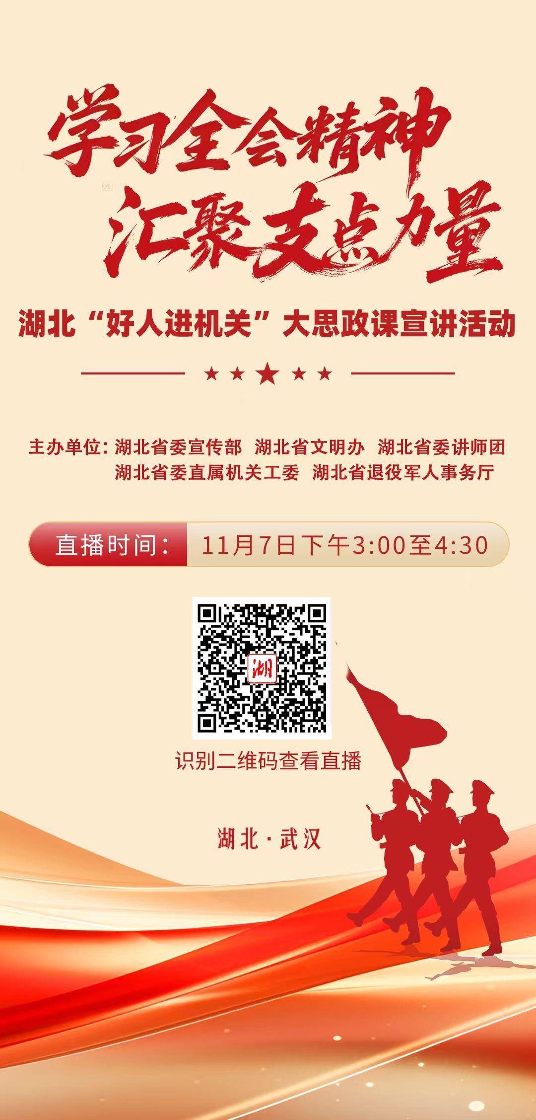 据介绍,本次活动以“学习全会精神 汇聚支点力量”为主题,由湖北省委宣传部、省文明办、省委讲师团、省委直属机关工委、省退役军人事务厅联合主办。
