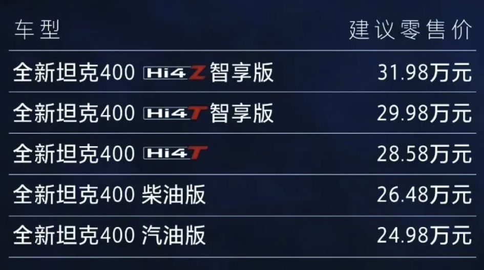 11月6日晚间,长城汽车宣布新款坦克400正式上市,24.98万元起售。