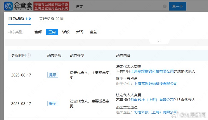 此前,陈睿已卸任上海宽娱数码科技有限公司、幻电科技(上海)有限公司法定代表人、执行董事职务。